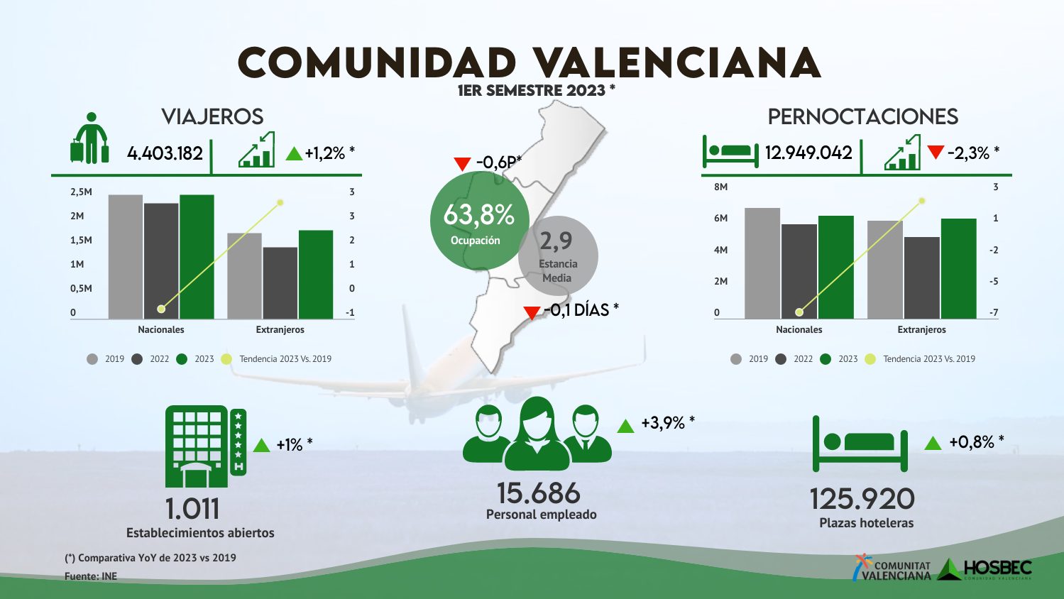 La Comunidad Valencia sobrepasa en número de viajeros los registros de un año de récord como 2019 anotando más de 4,4 millones y se queda a las puertas de igualar el volumen de pernoctaciones con más de 12,9 millones tras un descenso de 2,3% puntos porcentuales.