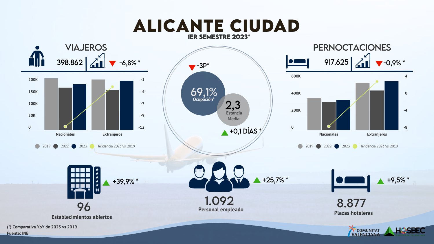 La ciudad de Alicante recoge casi los 399.000 viajeros durante los seis primeros meses de 2023, con una equilibrada proporción entre nacionales (48,2%) e internacionales (51,8%), quedándose a un 6,8% de los datos de 2019, que supone una perdida de prácticamente 28.900 viajeros.