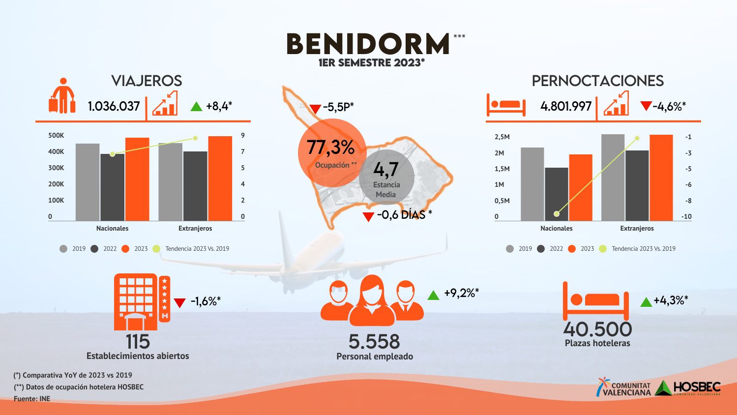 Los hoteles de la capital turística de la Costa Blanca albergan de enero a junio a más de 1 millón de viajeros, rebasando los datos de 2019 en más de 80.200 huéspedes (+8,4%). Representando nada más y nada menos que el 23,5% de los viajeros totales recibidos en la Comunidad Valenciana, de los cuales el 49,5% son de origen español y el 50,5% de origen internacional, encabezando este último por el mercado británico 43,1% sobre el total y un 75,7% sobre la cuota de internacionales.