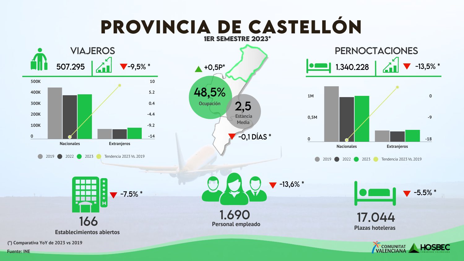 La provincia de Castellón supera el medio millón de viajeros en la primera mitad de 2023, registrando una caída del 9,5%, que supone una pérdida de 53.000 turistas hospedados en hoteles. Destacando el predominio del mercado español, que representa un 80,2% a pesar de descender un 13,2%.