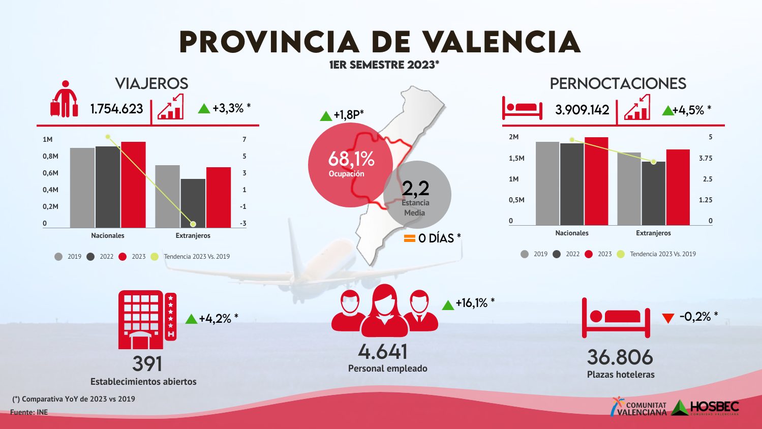Entre los destinos con tendencias positivas destaca la ciudad de València que no sólo aumenta su producción turística (pernoctaciones hoteleras) en un 8,2% anotando los 2,2 millones, sino también en número de viajeros que eligen sus hoteles como hospedaje, rebasando el millón y creciendo en un 9,7% respecto a los registros del último año de actividad normalizada.