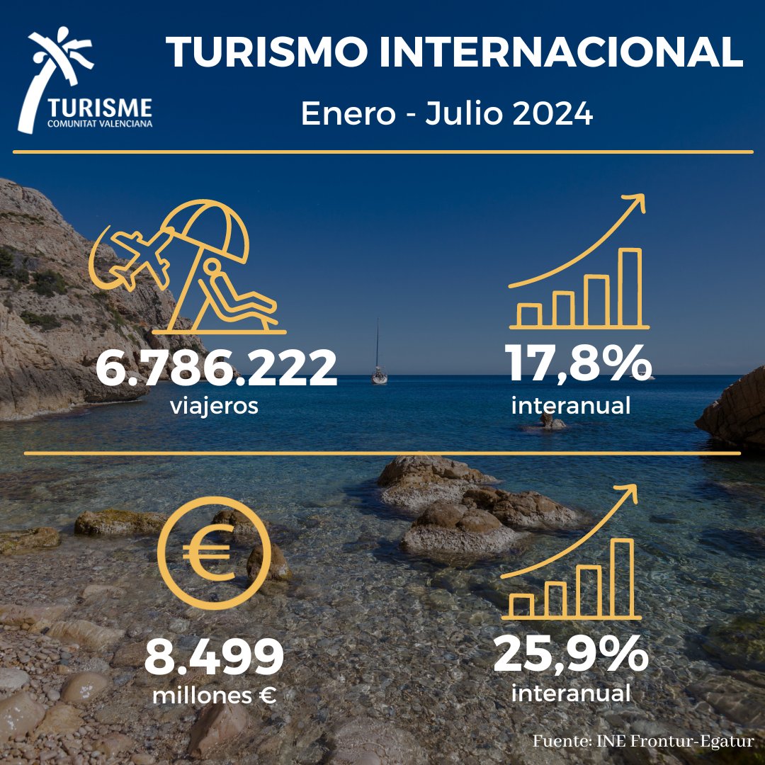 La Comunitat Valenciana ha registrado durante los primeros siete meses del año un total 6.786.222 turistas internacionales, un 17,8 % más que el año pasado, y desembolsaron un total de 8.499 millones de euros, un 25,9 % más que en 2023.