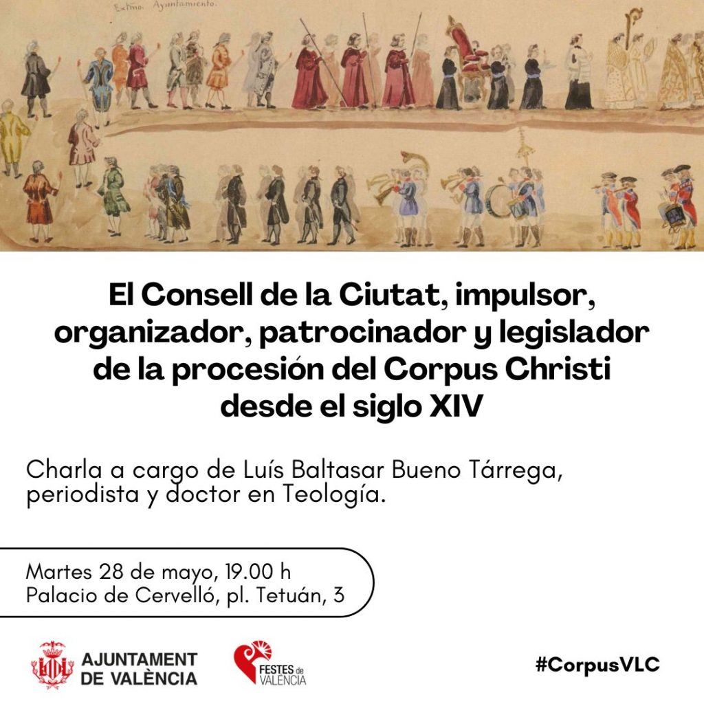 Este encuentro especializado, al que se invita a toda la ciudadanía, dará comienzo a las 19:00 horas en la sede del Palacio de Cervelló, sito en la plaza de Tetuán, 3. En el mismo lugar y a la misma hora, pero mañana martes, las personas interesadas podrán disfrutar de un segundo encuentro, en este caso bajo el título general “El Consell de la Ciutat, impulsor, organizador, patrocinador y legislador de la procesión del Corpus Christi desde el siglo XIV”. La charla correrá a cargo del periodista y doctor en Teología Luis Baltasar Bueno Tárrega.