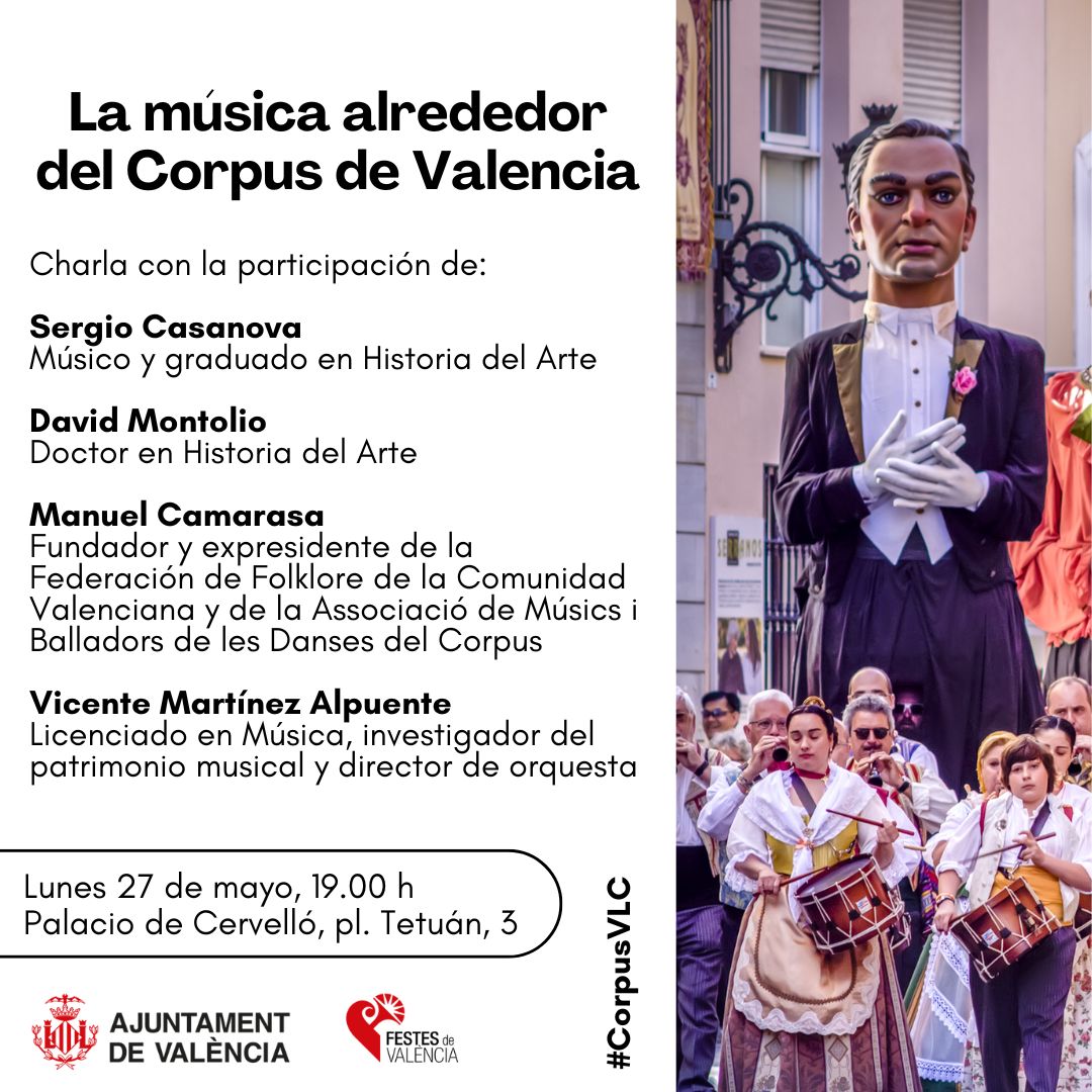 La charla de esta tarde lleva por título “La música alrededor del Corpus de València”, y contará con la participación de cuatro expertos: Sergio Casanova, músico y graduado en Historia del Arte; David Montolio, doctor en Historia del Arte; Manuel Camarasa, fundador y presidente durante muchos años de la Federación de Folklore de la Comunidad Valenciana y de l’Associació de Músics i Balladors de les Danses del Corpus; y Vicente Martínez Alpuente, licenciado en Música, investigador del patrimonio musical y director de orquesta.