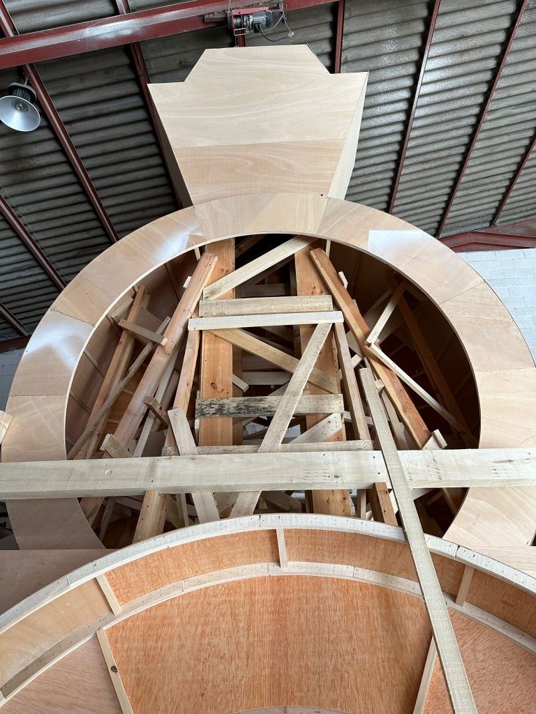 - La estructura central la conforman más de dos toneladas de madera de pino de Suecia lo que para el artista supone “que arderá de una manera limpia”