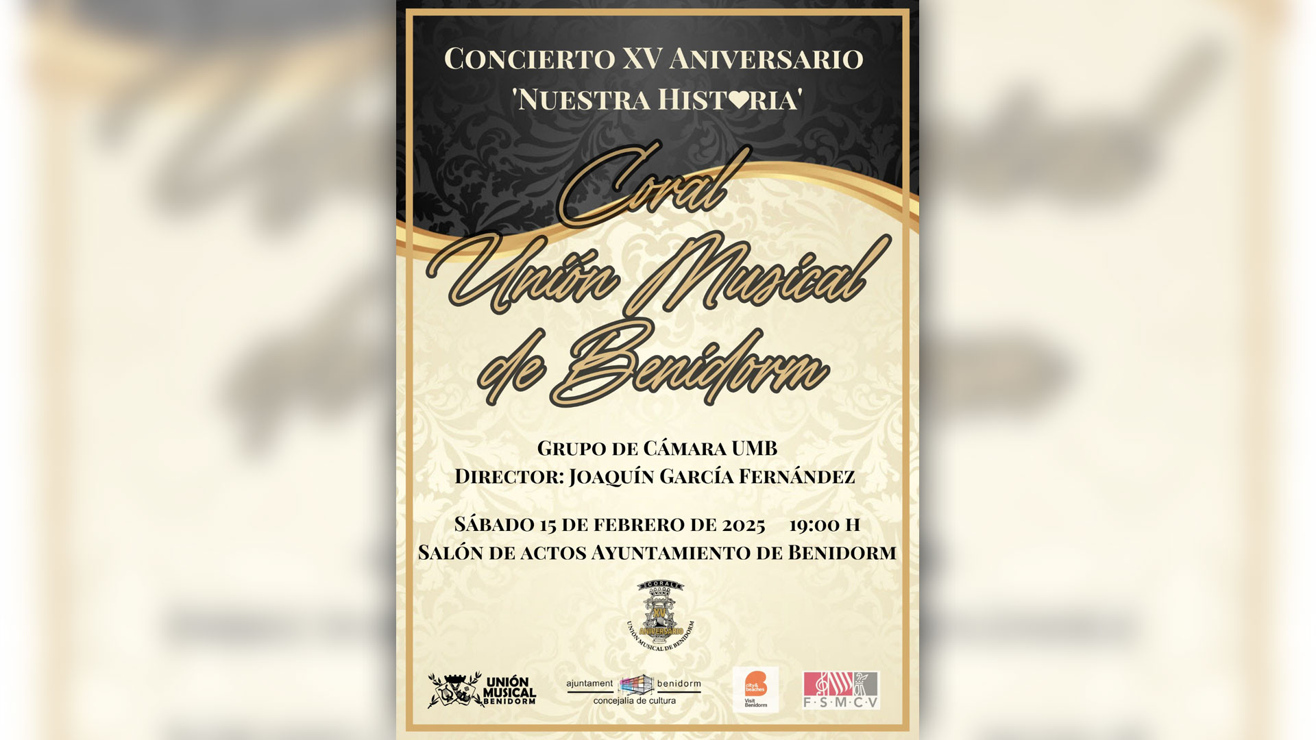 La Coral de la Unión Musical de Benidorm celebrará este fin de semana su decimoquinto aniversario con un concierto que llevará por nombre ‘Nuestra historia’ y que tendrá lugar el sábado 15 de febrero a las 19 horas en el Salón de Actos del Ayuntamiento. La asistencia al mismo es gratuita y se limita únicamente al aforo del recinto. La Coral de la UMB estará dirigida por Joaquín García Fernández.