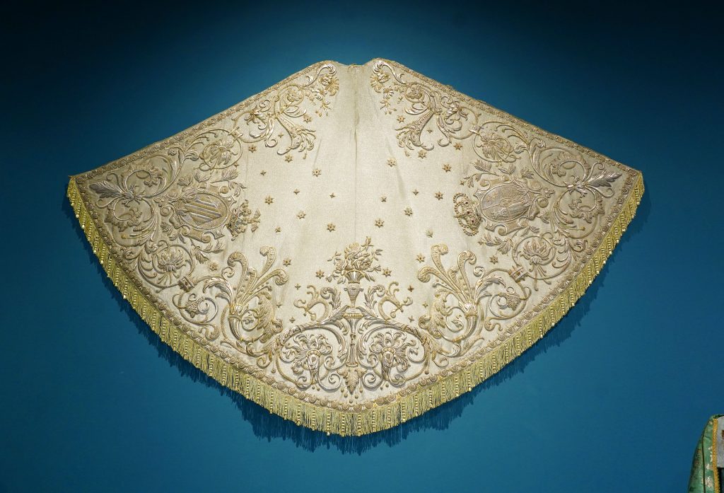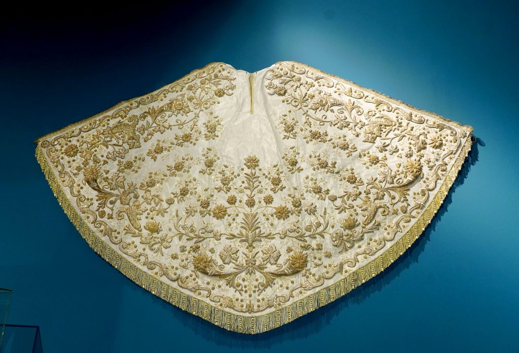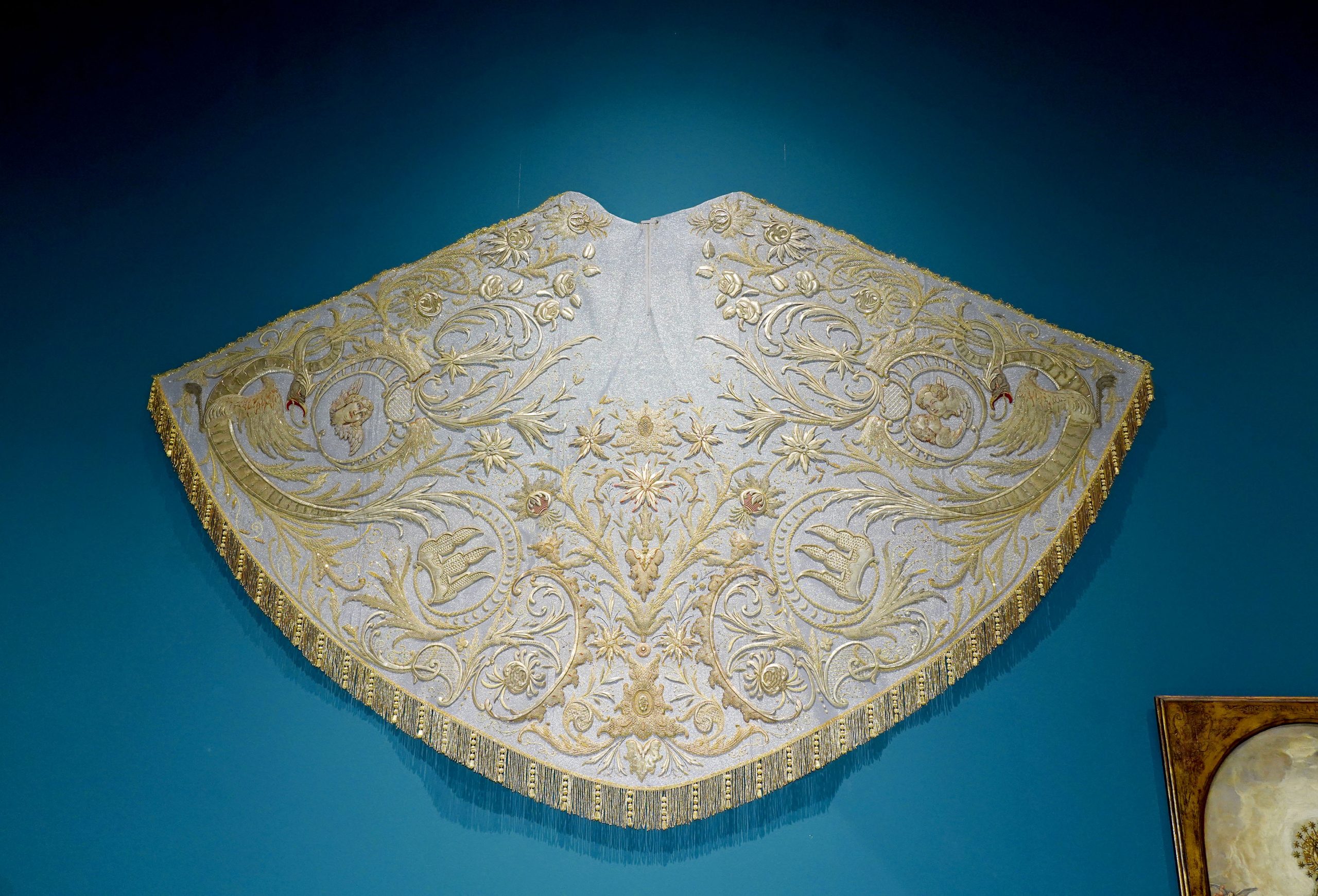 “La impresión de riqueza que puede desprender este conjunto de obras puede dar lugar a engaño, por eso tenemos que tener en cuenta que son obras excepcionales realizadas en otros contextos, como los mantos históricos de la Virgen de los Desamparados: el de la Coronación, de 1867, restaurado tres veces; el del Capellán Mayor Germán Mata, de 1915; el de la Familia Burillo, de 1940; y el manto del Año Mariano Universal, de 1954, al que conocemos como ‘el de las 100.000 perlas’”, ha indicado. Del mismo modo, en esta muestra se expone, por primera vez, un manto interior del siglo XVIII, bordado sobre tisú de seda, colocado sobre un miriñaque, o armazón.