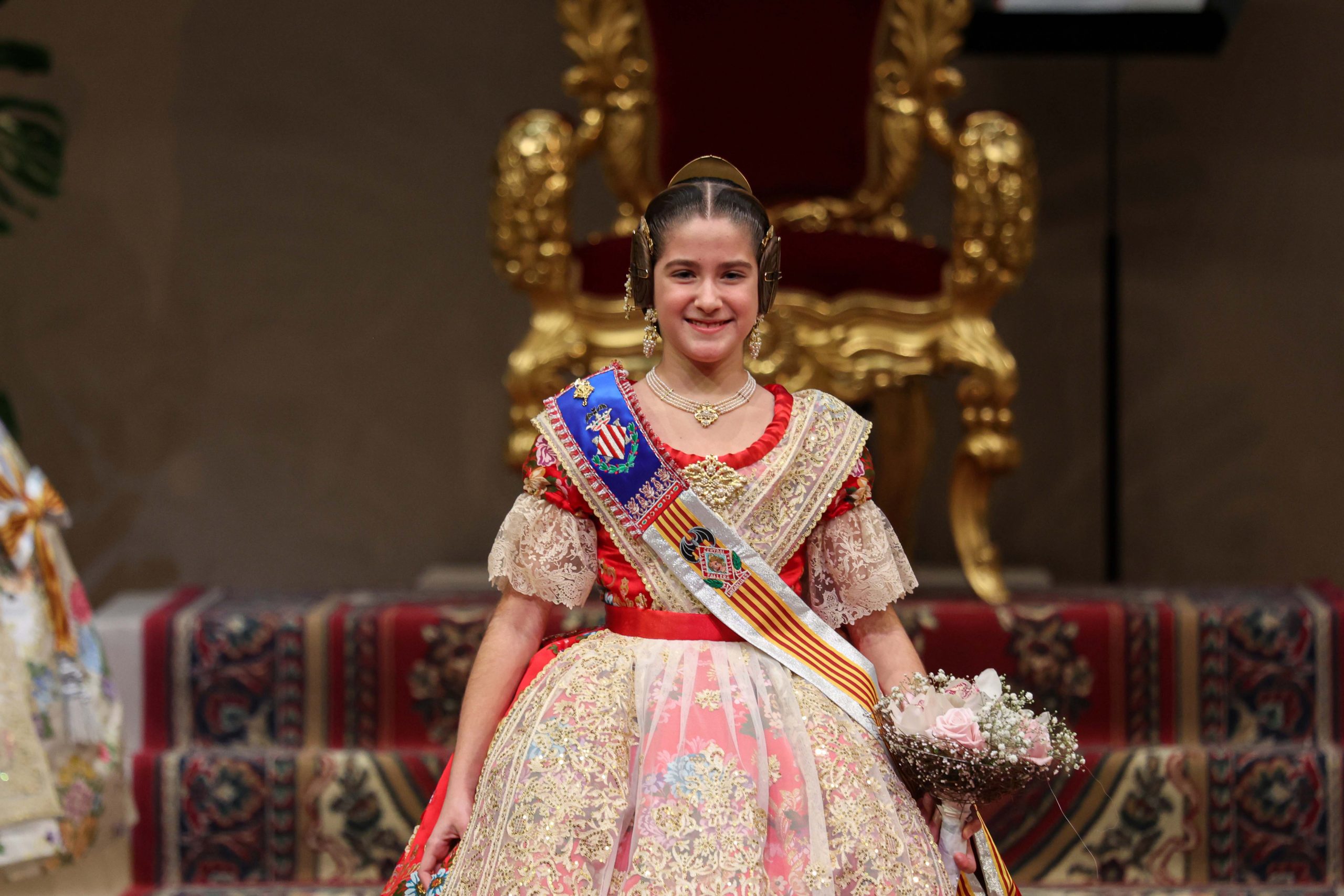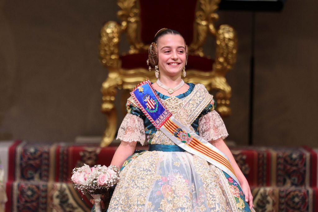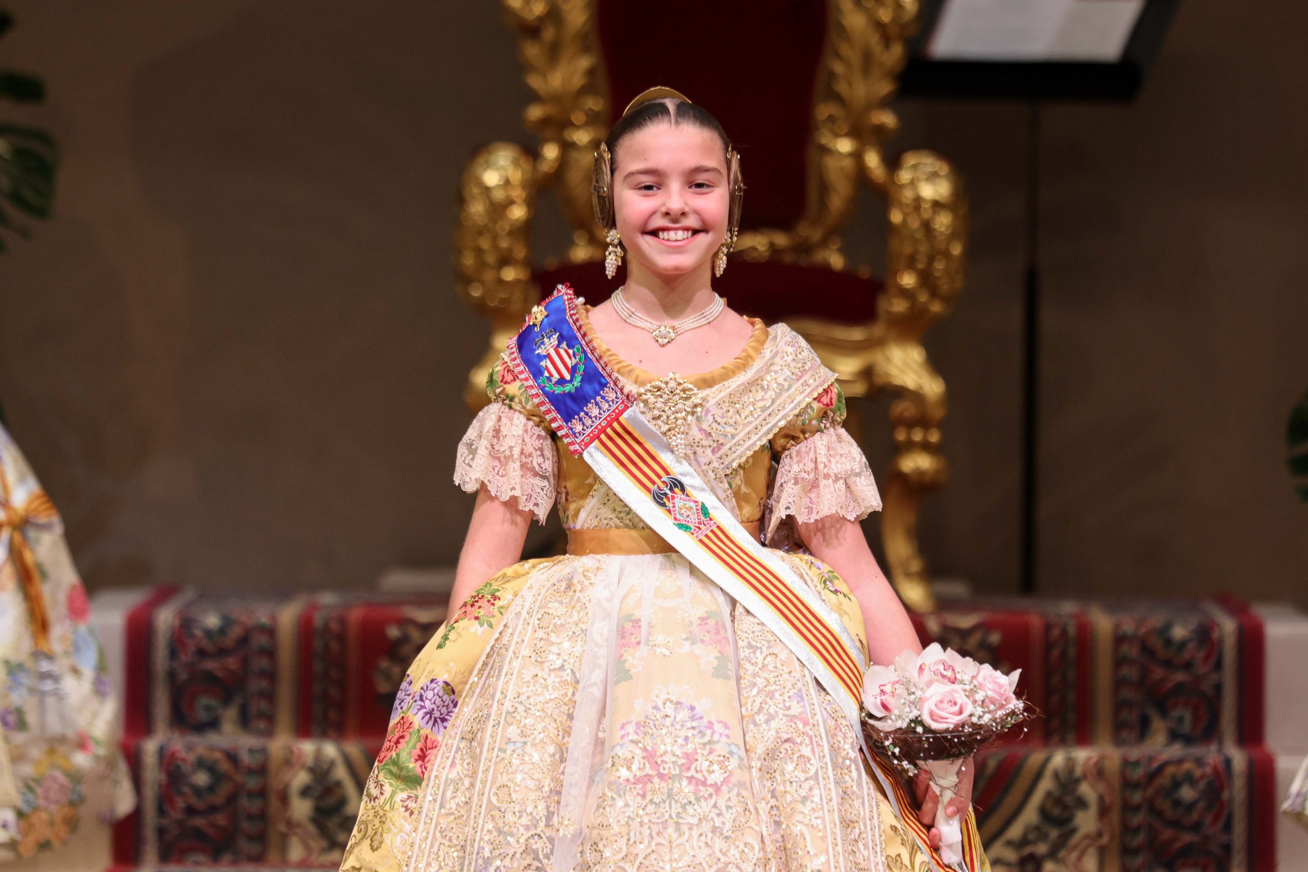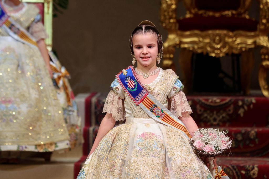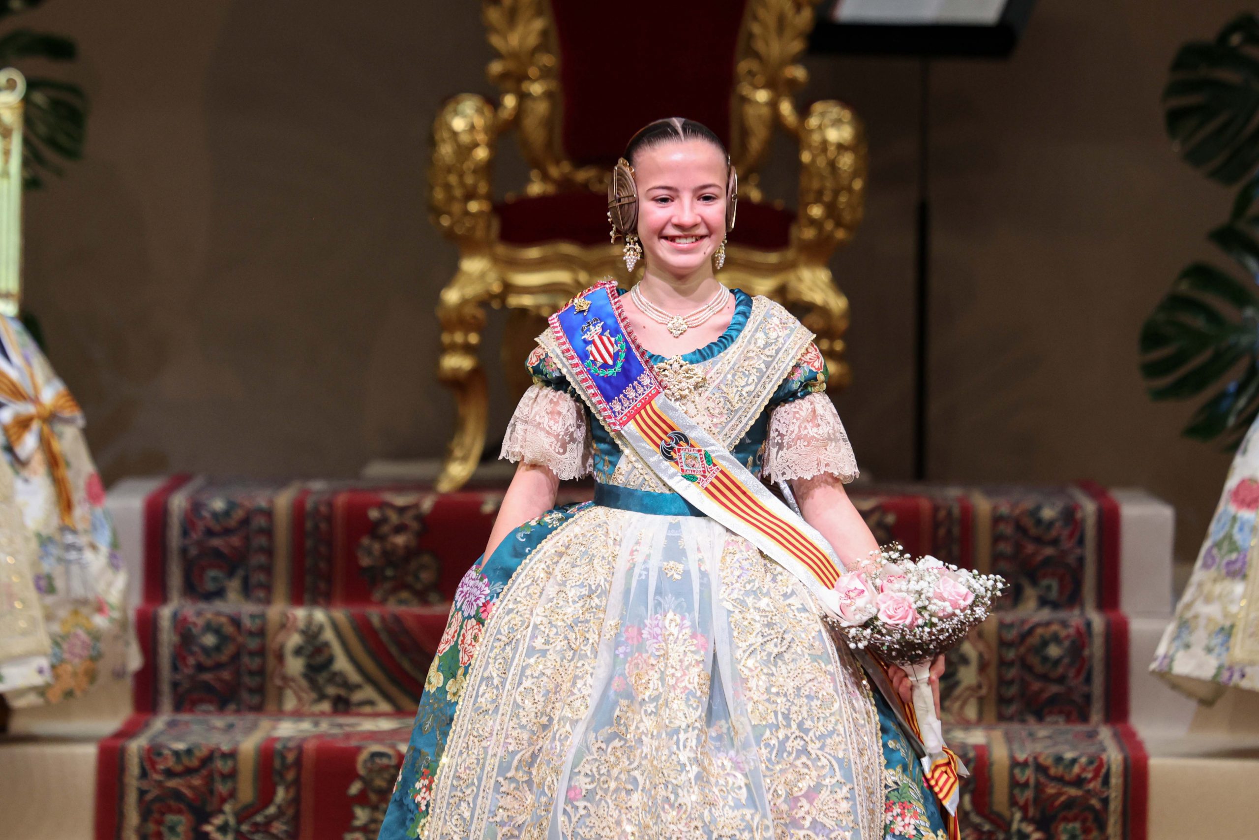 Alegres, simpàtiques i rialleres, les 12 han desfilat una per una, al so de la Suite Cort d’Honor, fins a arribar a l’escenari on les esperava el president de Junta Central Fallera, Santiago Ballester. Els aplaudiments d’autoritats, familiars, amistats i representants de totes les comissions de la ciutat han embolicat el Palau de la Música.