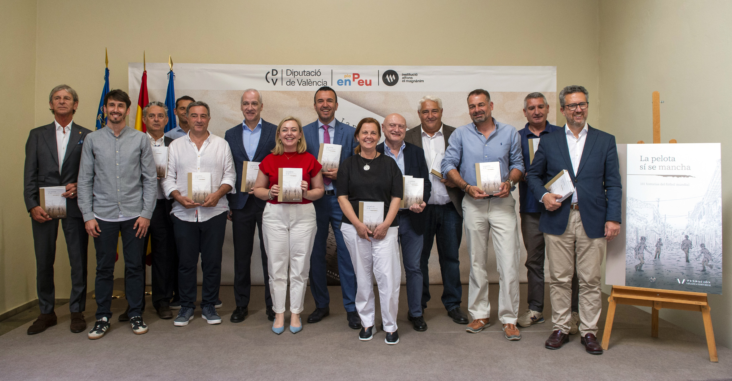 La Diputació de València ha acogido este martes la presentación del libro ‘La pelota sí se mancha. 101 historias del fútbol mundial’, una iniciativa solidaria que ha unido al mundo del fútbol y al de las letras con el propósito de ayudar a las familias más afectadas por la dana de Valencia. Se trata de un libro escrito de manera colectiva por personajes destacados relacionados con el fútbol, como es el caso de Vicente del Bosque o Luis de la Fuente, además de escritores y periodistas de prestigio, que componen una obra solidaria sin precedentes con más de un centenar de historias y relatos entorno al mundo del balompié.
