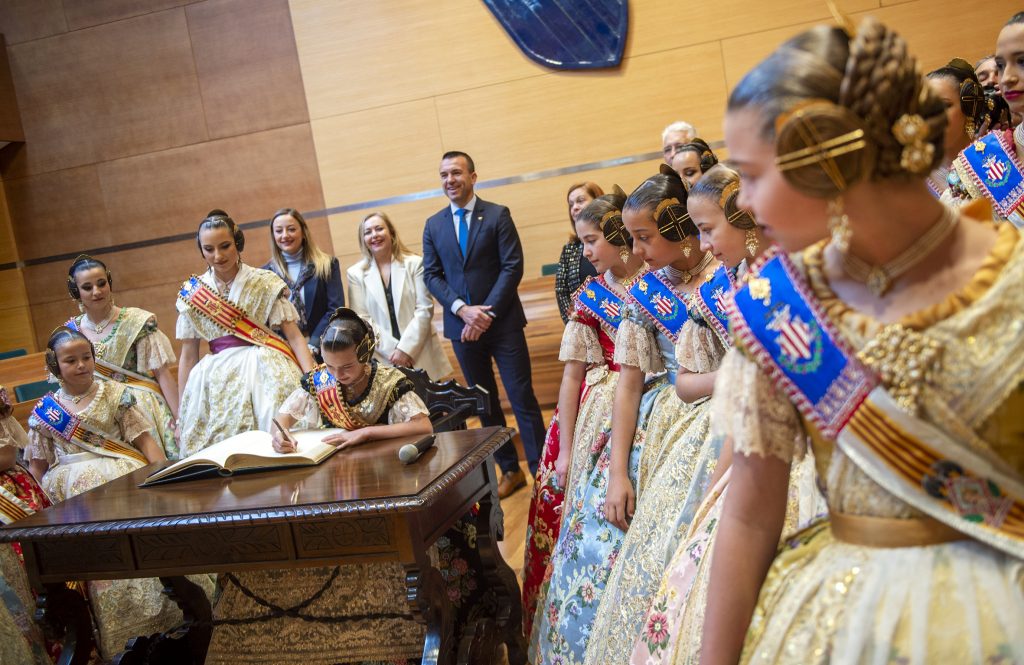 Tras la firma en el Libro de Honor y la visita a la exposición ‘Ninots’, instalada en el Salón de Reinas de la Diputación y con entrada gratuita hasta el 19 de marzo, Estela y Marina han participado junto al presidente Mompó, las vicepresidentas Enguix y Mazzolari y diputadas y diputados de la corporación, en la recepción a las Juntas Locales Falleras.