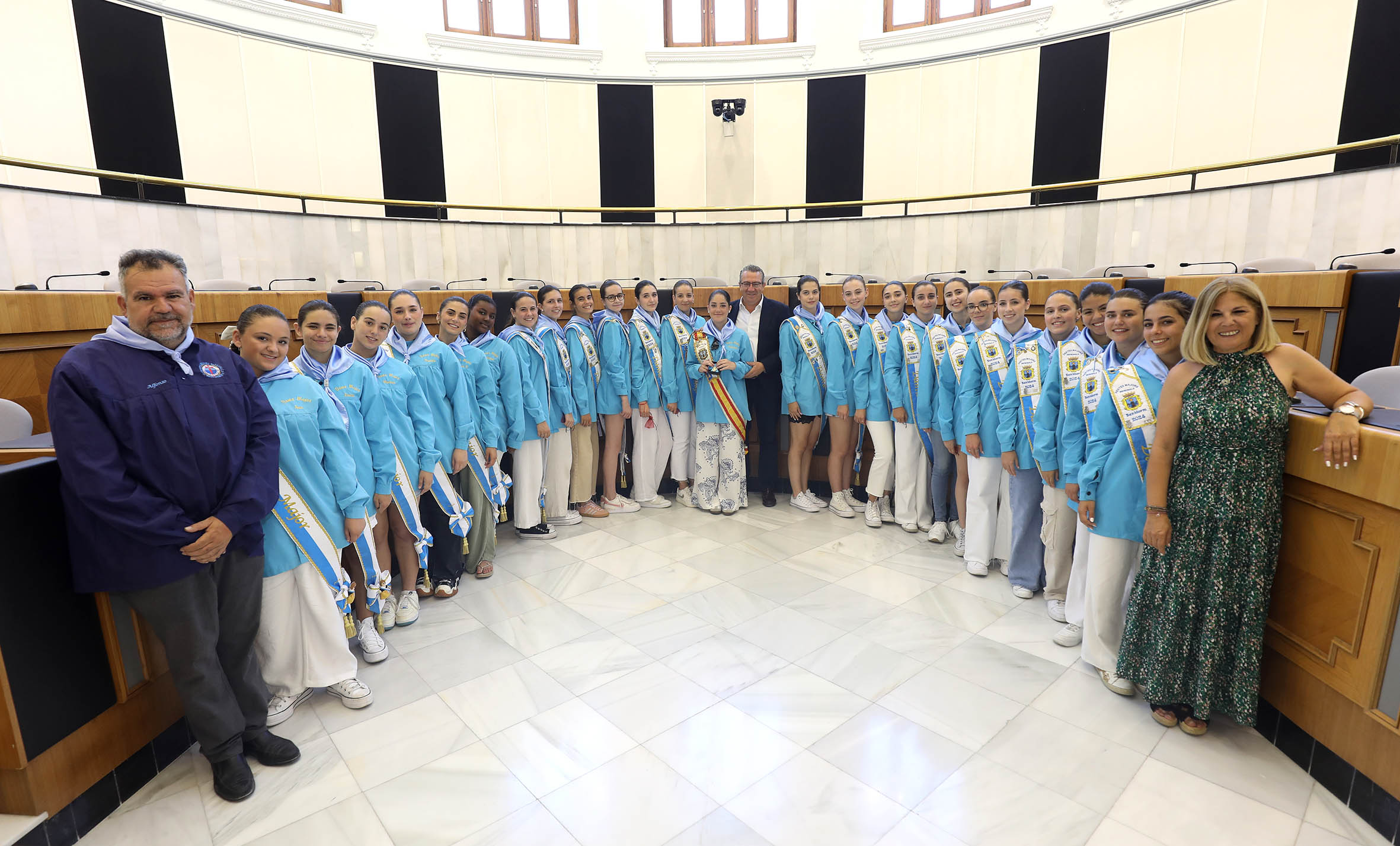 La Reina de las Fiestas adulta, Valentina Almodóbar, y sus damas han visitado el Salón de Plenos, donde el presidente les ha hecho entrega de la insignia con el escudo oficial de la Diputación, mientras que a la Reina también se le ha impuesto la caramba.