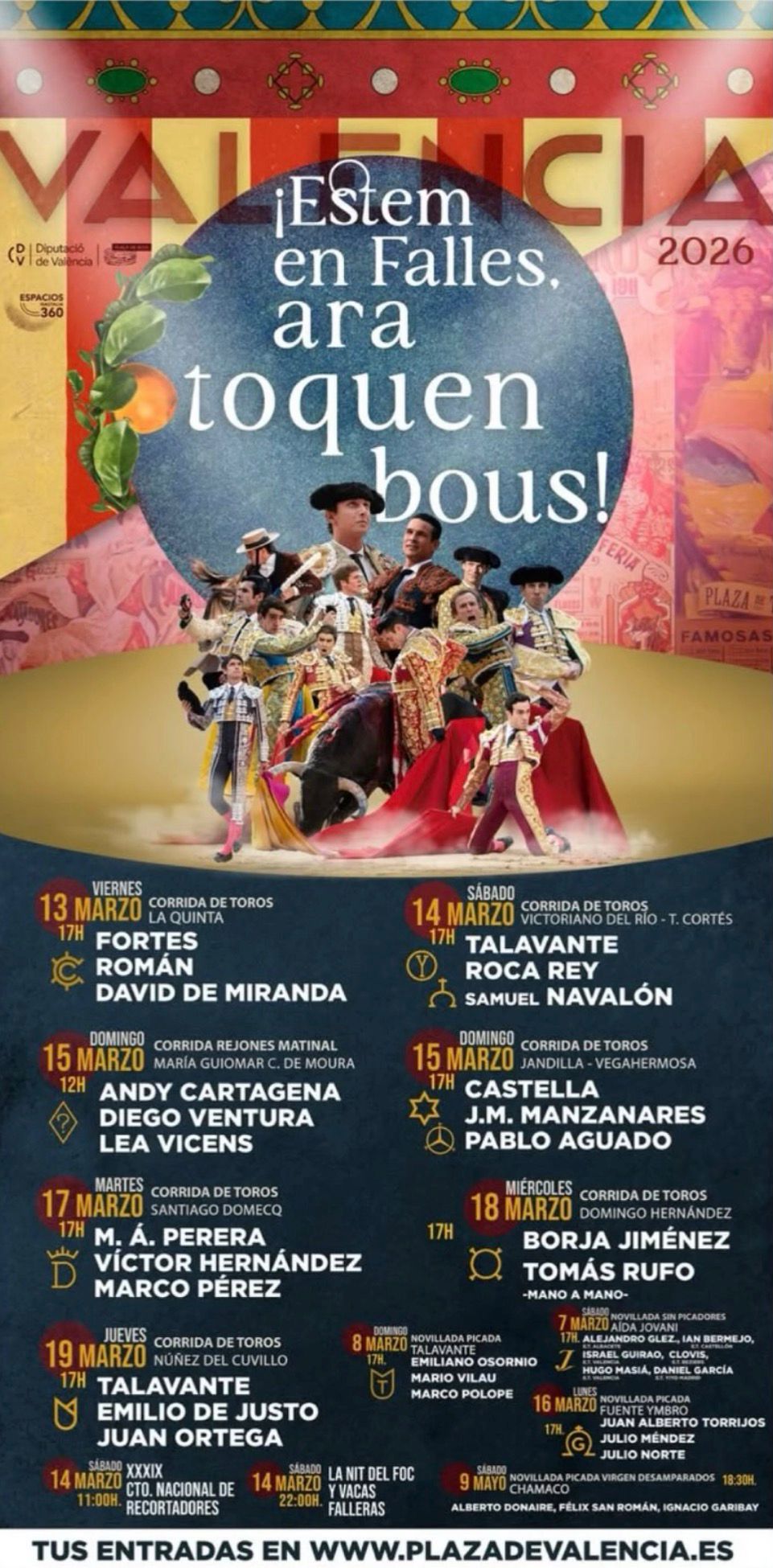 La Feria de Fallas, la primera gran feria de la temporada taurina a nivel mundial, seguirá contando con las principales figuras actuales de la tauromaquia, destacando el doblete de Alejandro Talavante los días 14 y 19 de marzo, la presencia temprana de Andrés Roca Rey en la corrida del 14 de marzo, y la presencia de otros diestros consagrados como Sebastián Castella, Jose María Manzanares y Pablo Aguado, que torean juntos en la vespertina del 15 de marzo; Miguel Ángel Perera el 17 de marzo; y Emilio de Justo y Juan Ortega, que cerrarán la feria el día de San José.