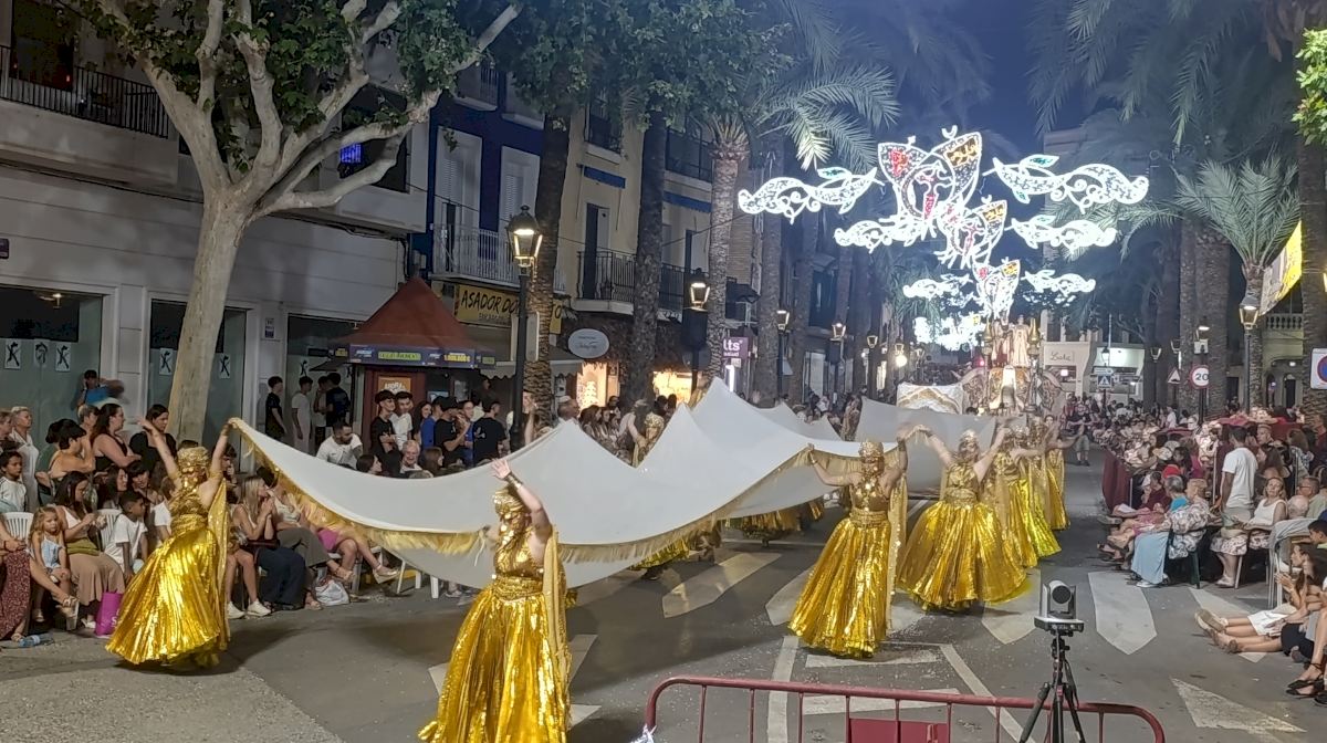 A las 20:30 horas, la fuente de la Calle Castelar ha sido el punto de encuentro de todas las comparsas, que 15 minutos después han iniciado su recorrido por las principales calles del municipio. El sonido de las marchas moras y cristianas, acompañado por vistosos trajes y coreografías, ha envuelto cada rincón de la localidad.