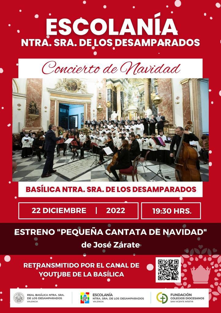 El concierto será retransmitido en directo por el Canal Youtube de la Basílica de la Virgen y constará de tres partes. En la primera, actuará la Escolanía sola a capela, en la segunda parte, será estrenada la Cantata y, finalmente, la formación coral valenciana junto a antiguos escolanes y todo el conjunto instrumental ofrecerán un popurrí de villancicos populares.