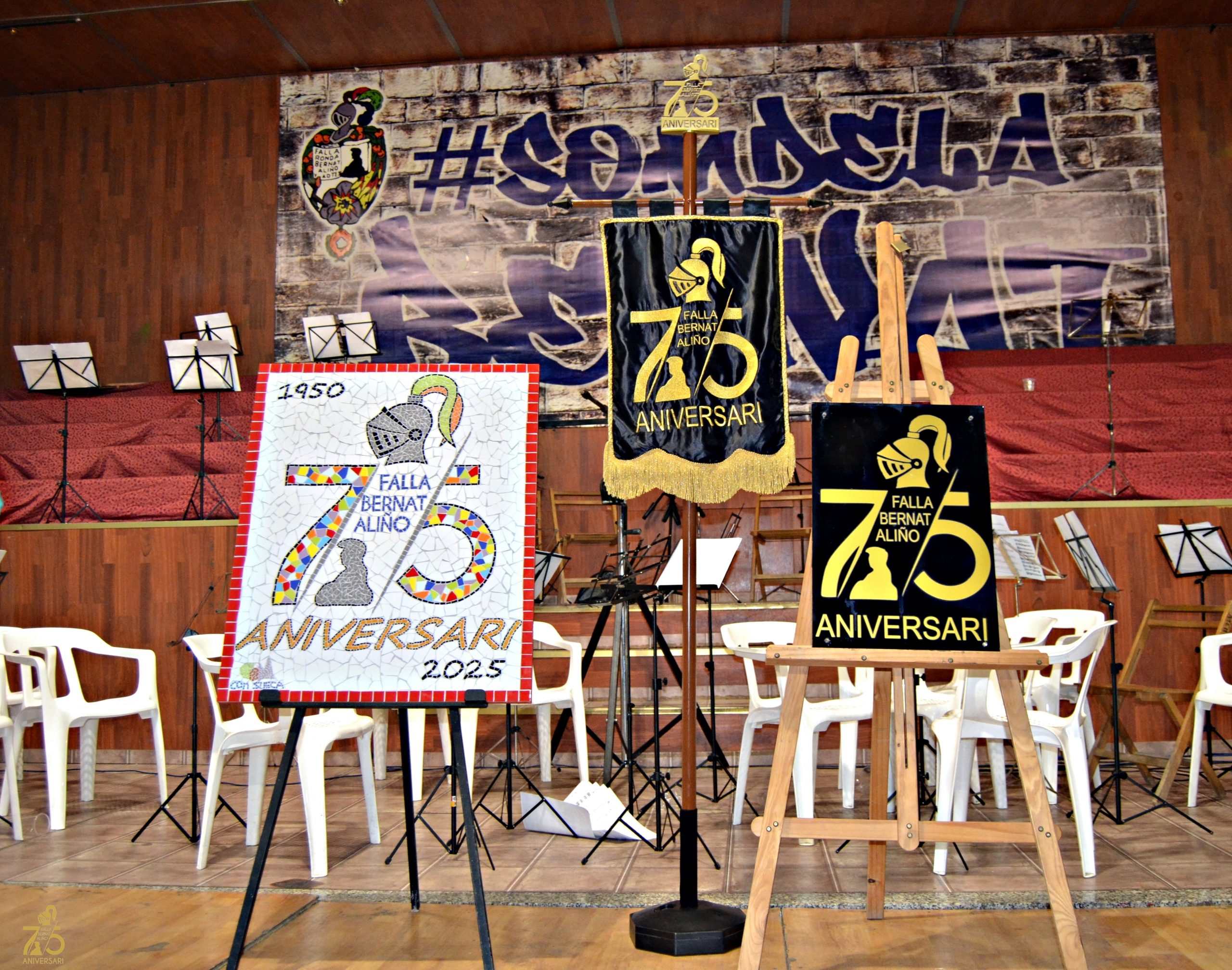 Les conductores de l’acte, ens endinsaren i transmeteren la il·lusió i entrega en què el comité organitzador d’aquesta gran efemèride han preparat per a l’ocasió. S’ha fet un banderí nou amb motiu d’aquest 75 aniversari, banderí que els quatre representants d’aquest passat exercici han volgut regalar a la Comissió, i que va ser pujat amb tots els honors i mostrat-lo per primera vegada, de la mà de l’abanderat de la falla Ivan Moreno Melià. A continuació es va presentar el Logo preparat en especial per a l’aniversari de la mà del seu creador Lucas Soler Lorente que va pujar a l’escenari i va contar com li sorgís la idea i com la va plasmar. Seguidament, es va descobrir a l’escenari un bonic i original trencadís elaborat pels usuaris del Centre Ocupacional de Sueca, on la seua Directora Immaculada Garcia Mañez acompanyada per l’usuari del centre Ivan Moreno, ens contaren detalladament com s’elabora aquest minuciós i costos treball.