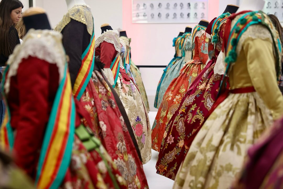 Los trajes son vestidos de seda con dibujos de los siglos XVIII, XIX y XX elaborados manualmente de forma artesana por el último velluter, Vicente Enguídanos y por firmas como Vives y Marí, Garín, Rafael Catalá o la Compañía Valenciana de la Seda.
