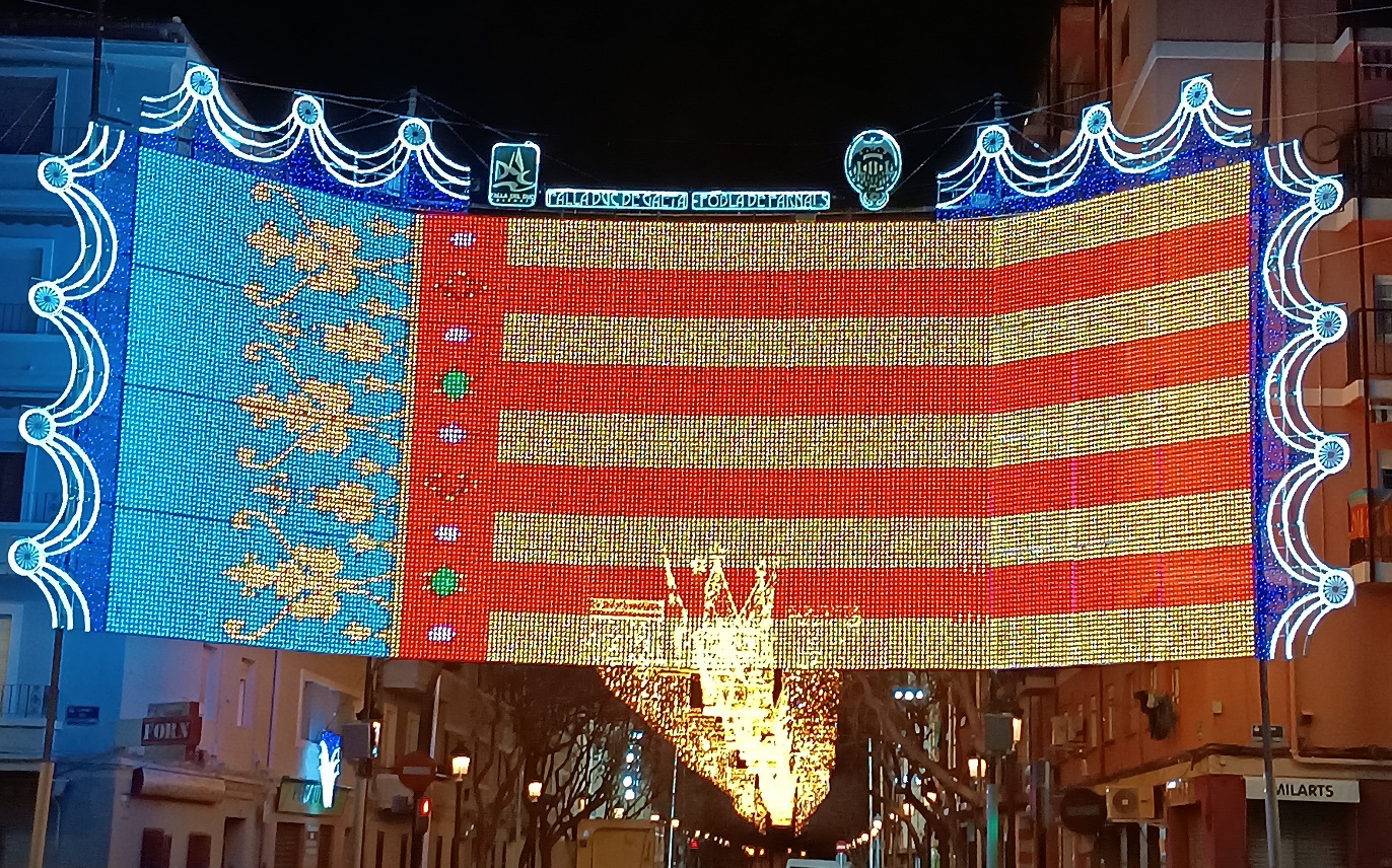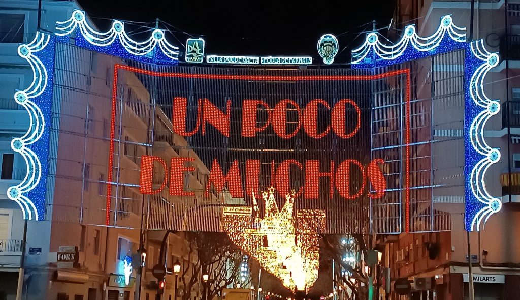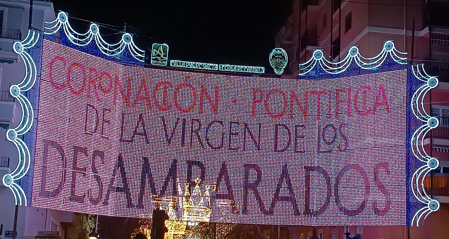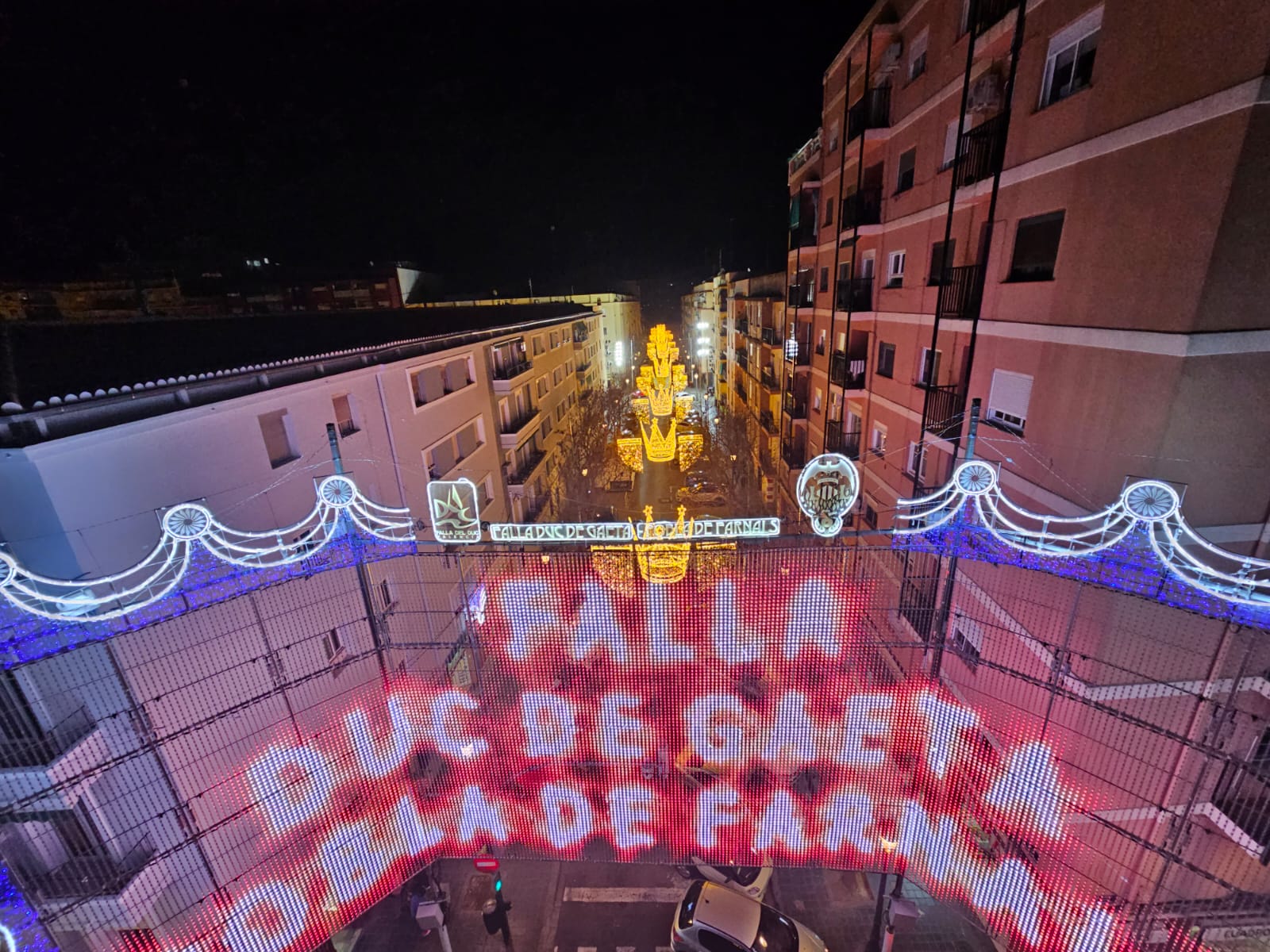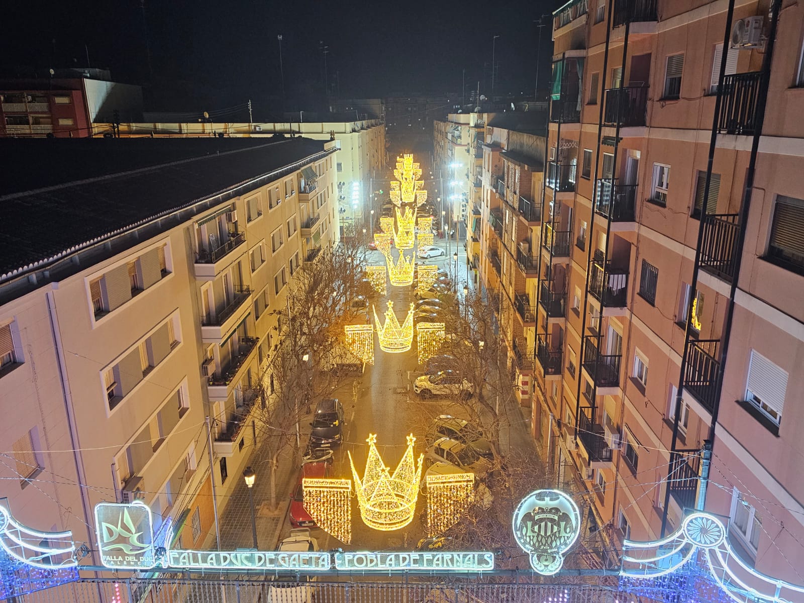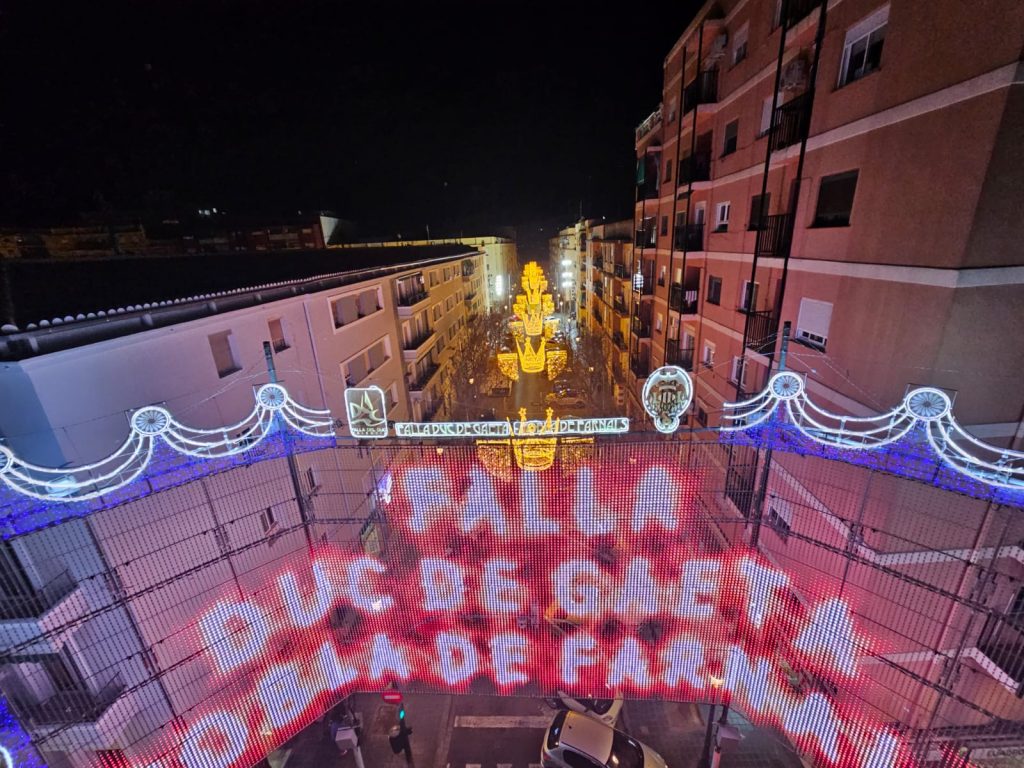 La Falla Duque de Gaeta – Pobla de Farnals ha instalado una iluminación especial en su demarcación, con motivo del Centenario de la Coronación de la Virgen de los Desamparados.