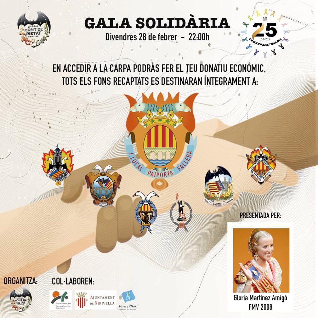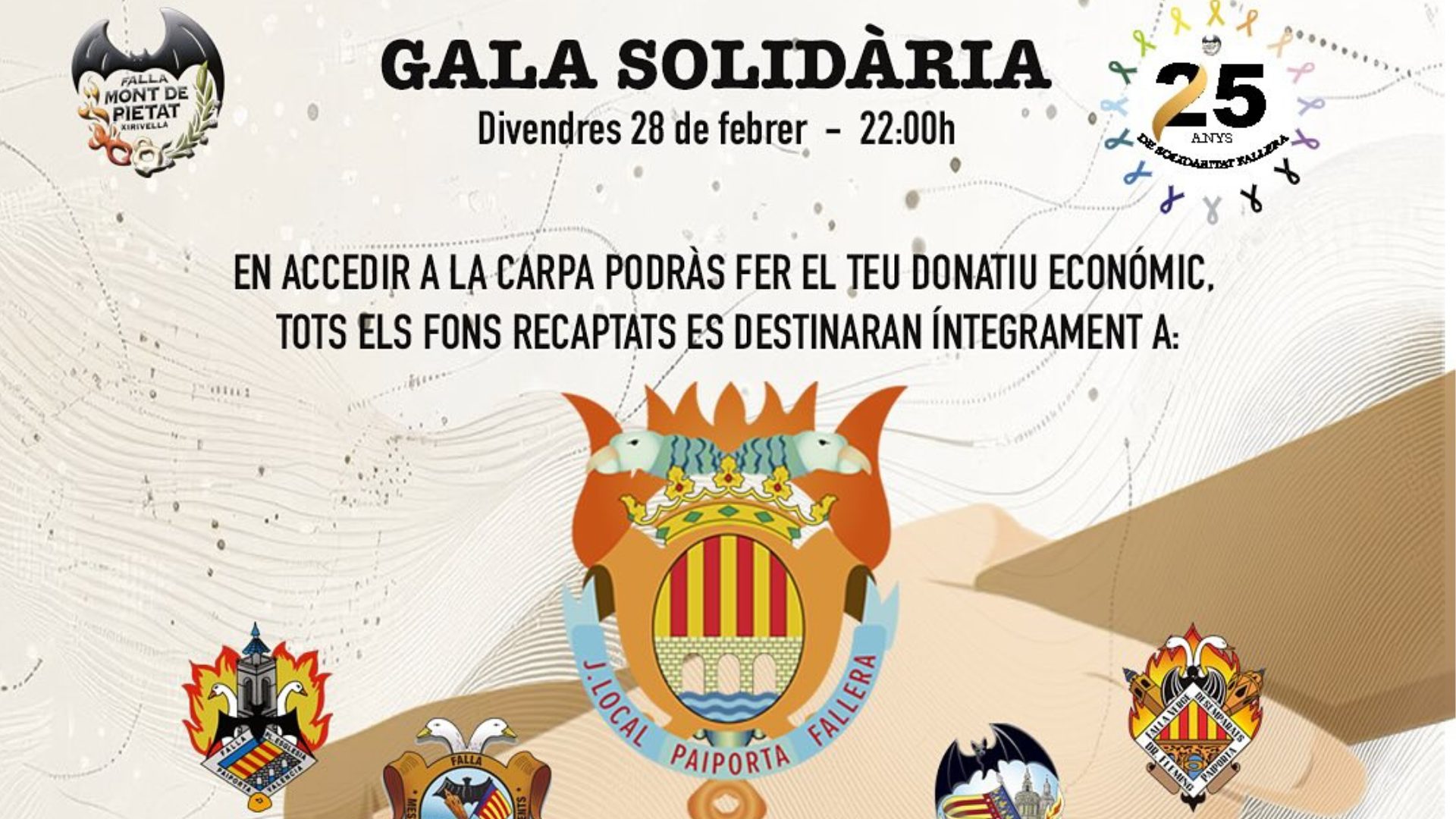 En la gala solidaria de la Falla Mont de Pietat colaboran la Fundació Horta Sud y el ayuntamiento de Xirivella. Una llamada a la solidaridad a toda la ciudadanía de Xirivella para colaborar con las fallas de Paiporta.