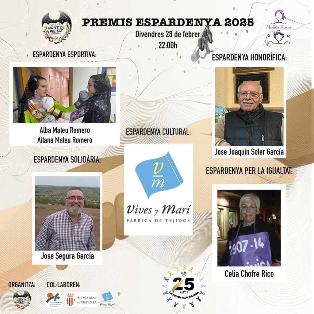 La Falla Mont de Pietat de Xirivella convoca a la gala solidaria, y a la entrega de los Premis Espardenya 2025, que se celebrará el próximo viernes, 28 de febrero a las 22:00 horas, en la calle Mediterráneo, 6 de Xirivella.