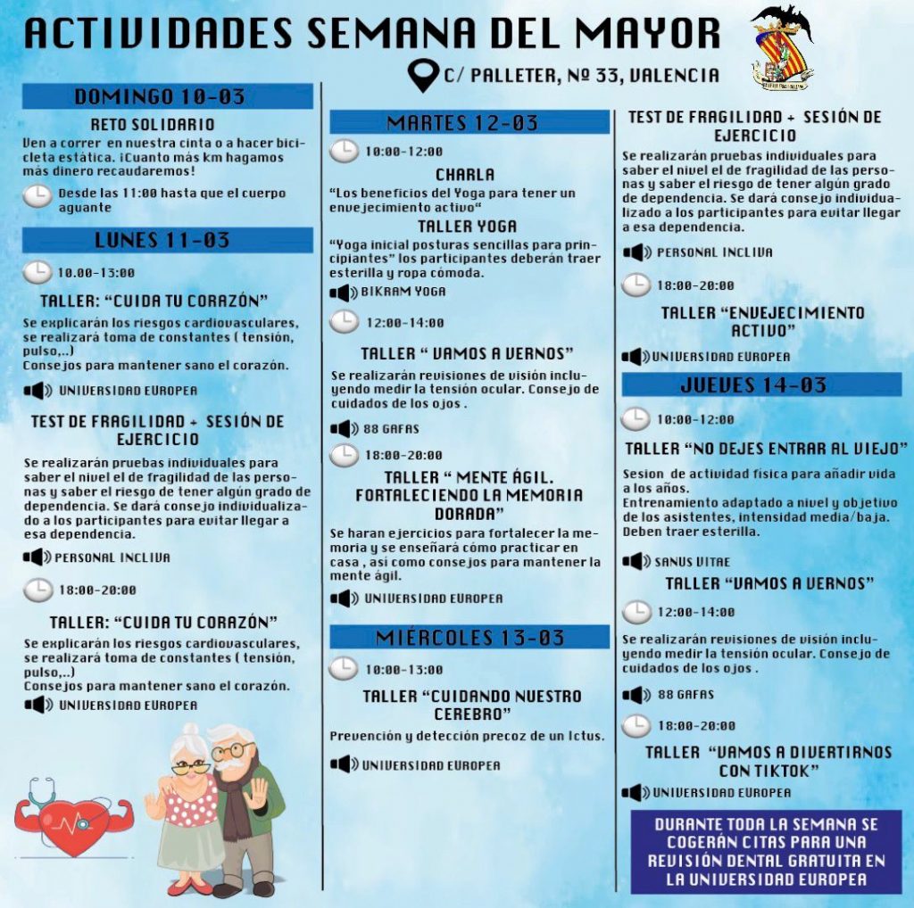 A lo largo del lunes, entre las 10 y las 13 horas y de 18 a 20 horas, se han programado unos controles para cuidar el corazón por parte de los estudiantes de Enfermería de la Universidad Europea de Valencia (UEV). Y el martes 12 y miércoles 13 de marzo también de 18 a 20 horas, la Universidad Europea de Valencia celebrará los talleres bajo el título “Mente ágil: fortaleciendo la memoria dorada” y “Envejecimiento activo”, respectivamente.