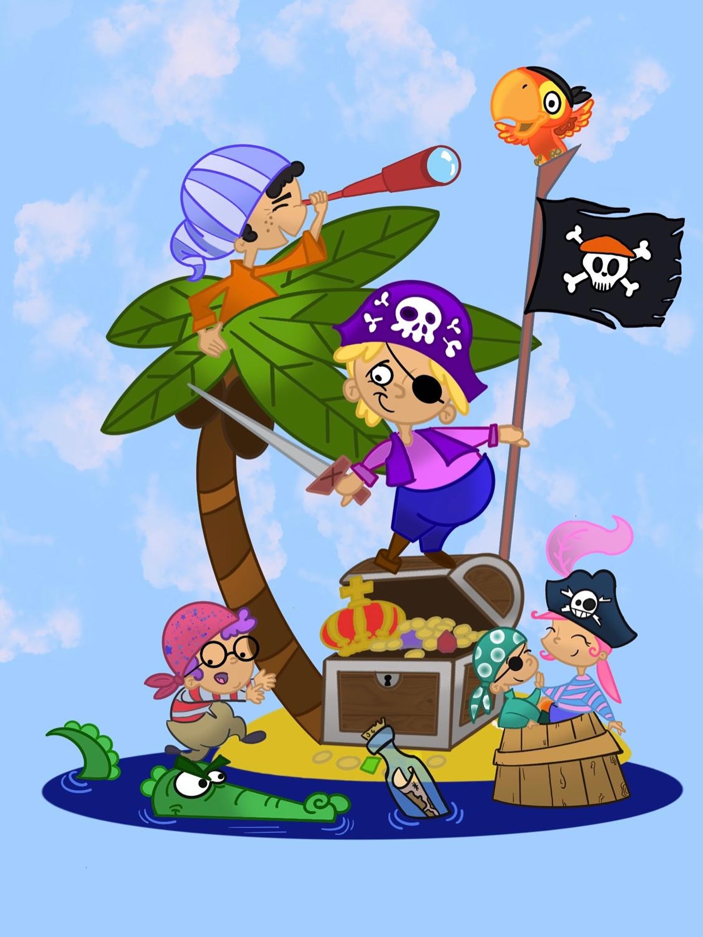 “Es una falla colorida y didáctica, como las que suelo trabajar. Representa a los niños jugando a ser piratas, recreando una isla del tesoro con aventuras y personajes entrañables: desde un capitán que descubre el botín hasta un cocodrilo que acecha en la escena”, explicó Guija.