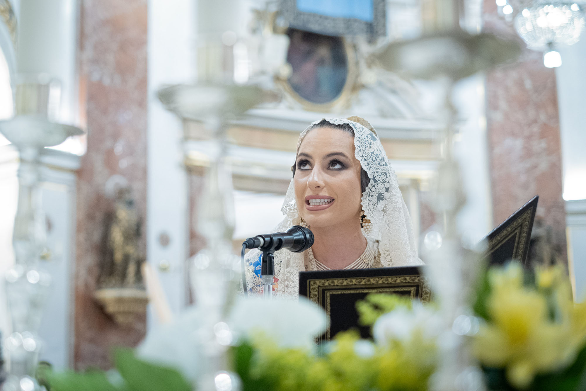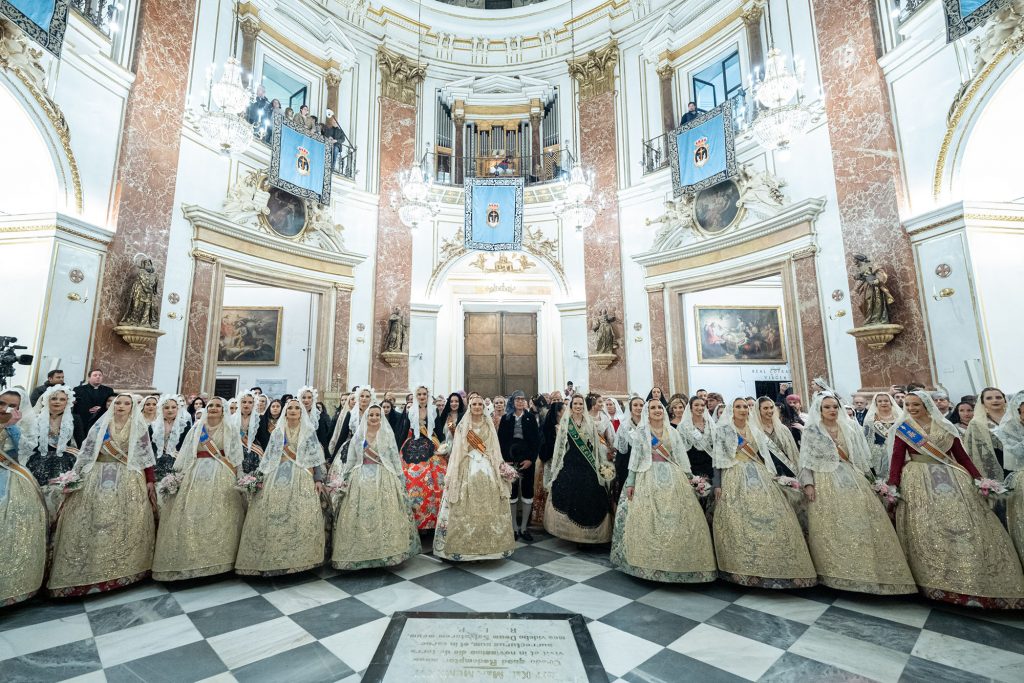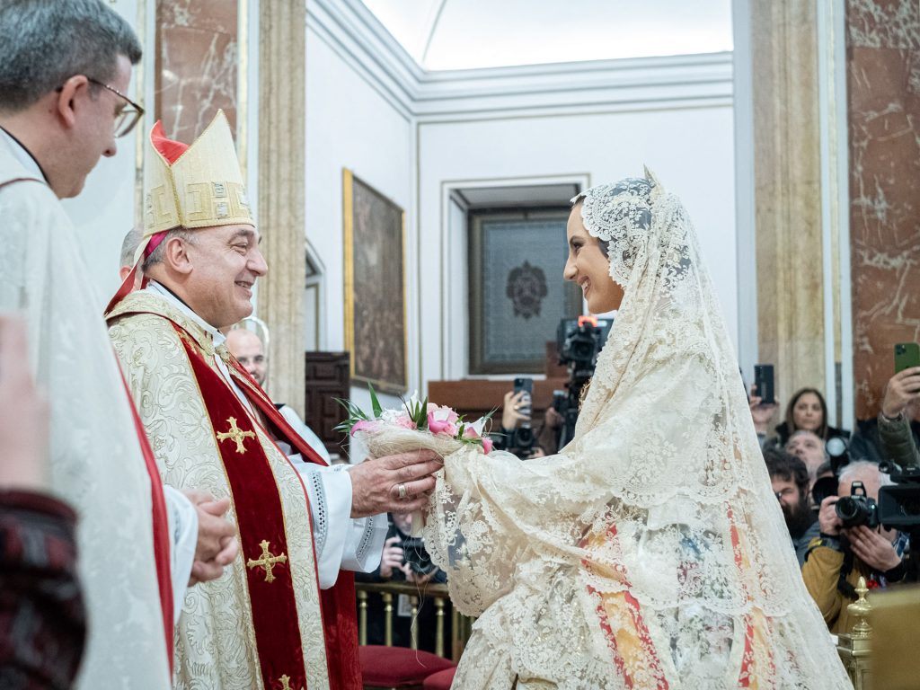 Una vez en la Basílica, la Fallera Mayor y todas las falleras de su Corte realizaron la ofrenda de su ramo ante la imagen de la Mare de Déu que preside el altar en un acto presidido por el Arzobispo en el que también estuvieron presentes el rector y el vicerrector, Melchor Seguí y Álvaro Almenar, respectivamente.