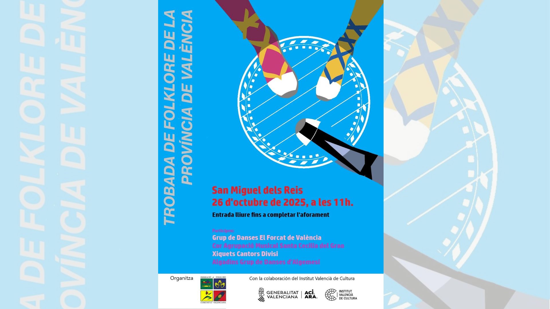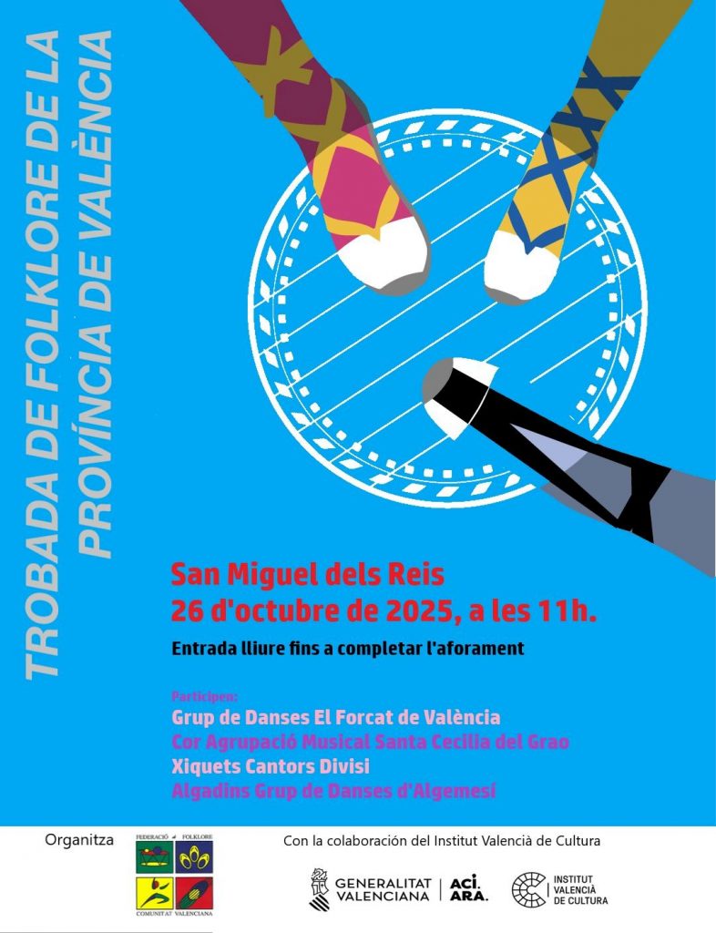 La Federació de Folklore de la Comunitat Valenciana ha organizado dos eventos dentro de sus objetivos de fomentar y difundir el folclore y la música tradicional valenciana. Uno tendrá lugar en el histórico enclave del Monasterio de San Miguel de los Reyes a las 11 horas y el otro en el Centro Cultural de la Beneficéncia de la Diputación de Valencia, a las 18 horas. La entrada es libre hasta completar aforo en ambos casos. El primero de los actos cuenta con la colaboración del Instituto Valencia de Cultura de la Generalitat Valenciana y al segundo se suma la Diputación de Valencia.