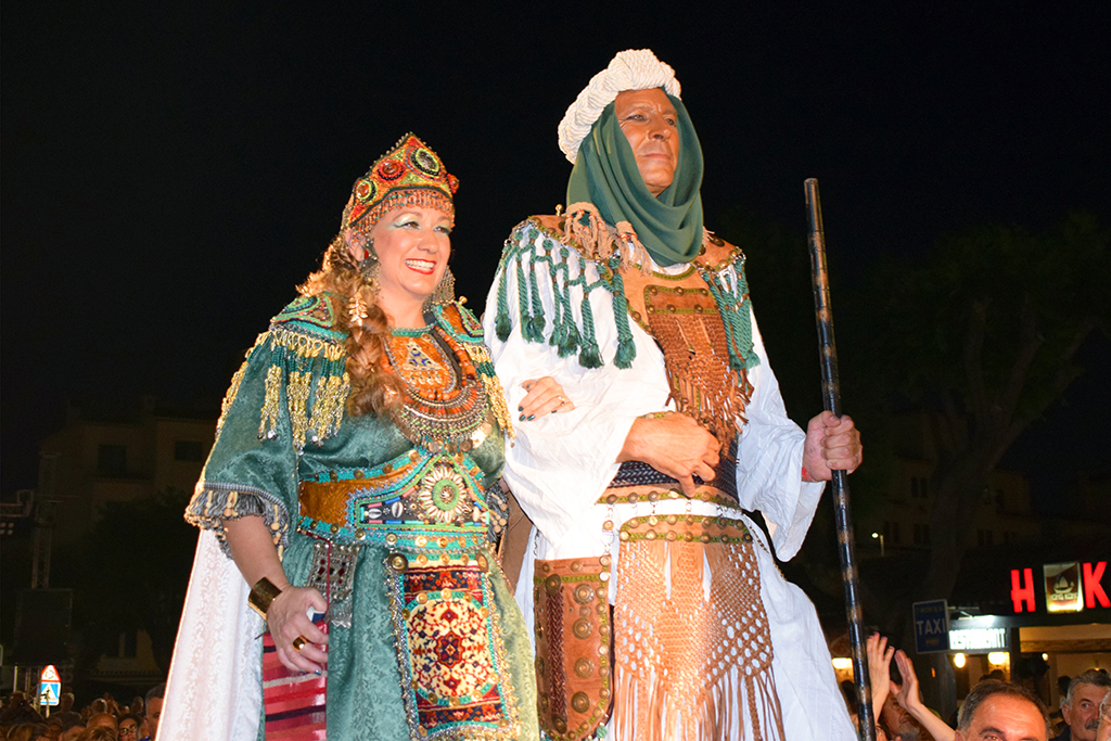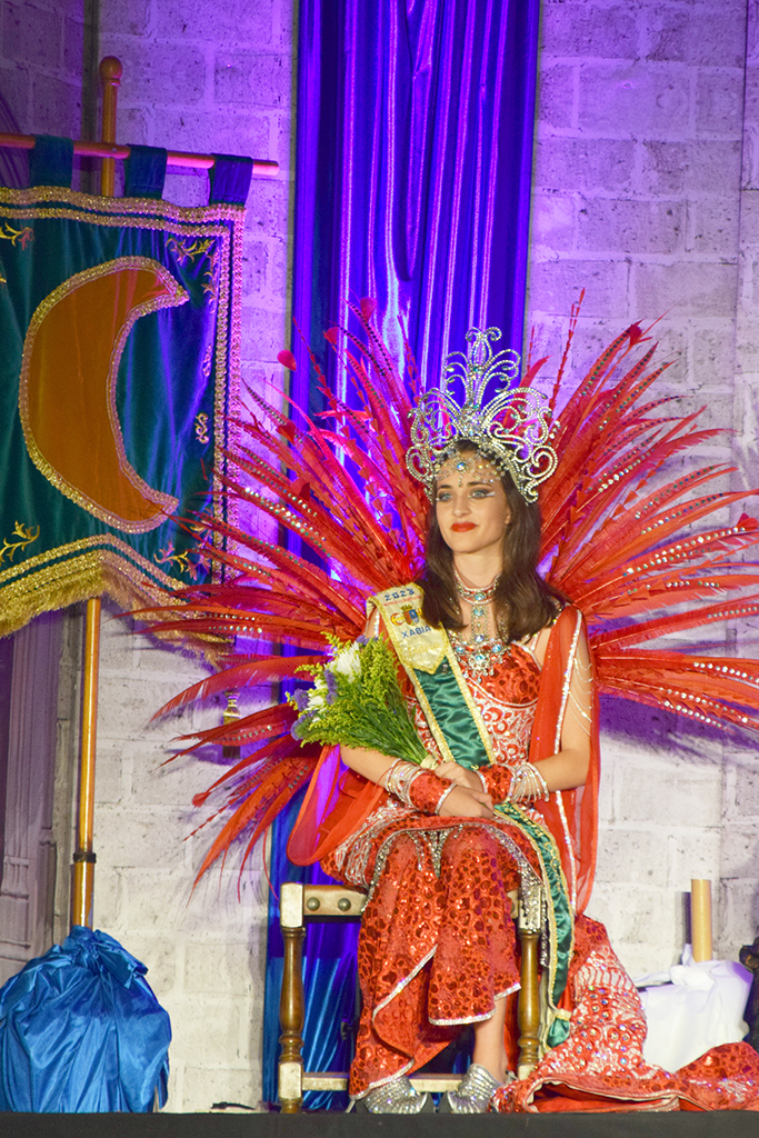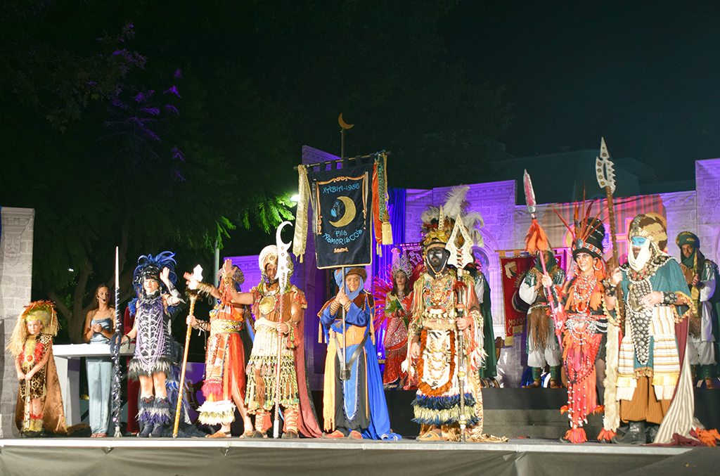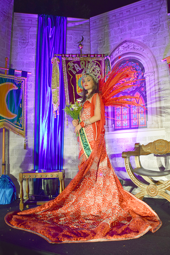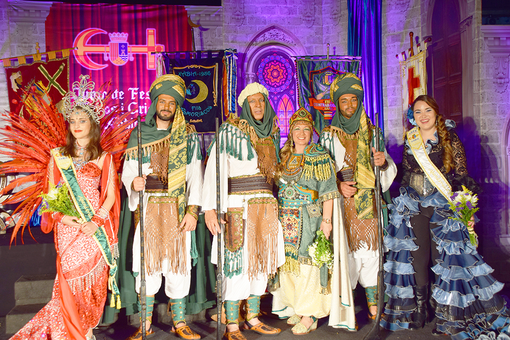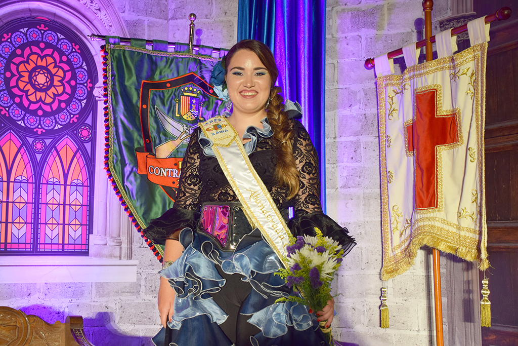 Luego llegó uno de los momentos más esperados de la noche: La presentación de las Abanderadas Mora y Cristiana encabezando sus respectivos bandos. Natalia marcó el paso a Ballesters, Trabuquers, Pirates de Sant Jaume, Bandoleres (Filà de nueva creación cuyo estandarte fue condecorado durante el acto), Faciners y Contrabandistes de Xàbia. Lo mismo hizo Indira que señaló el recorrido de Baharis, Schaitans, Xibia, Al-Tarik’s y Almoradins. Las filaes mostraron uno de sus secretos mejor guardados, los impresionantes trajes que lucirán en los Desfiles de Gala del sábado 22 y domingo 23. Por último, fue el turno de la Filà Almoriscos que majestuosa, subió al escenario para recibir su corbatín de manos de la alcaldesa de Xàbia, Rosa Cardona.