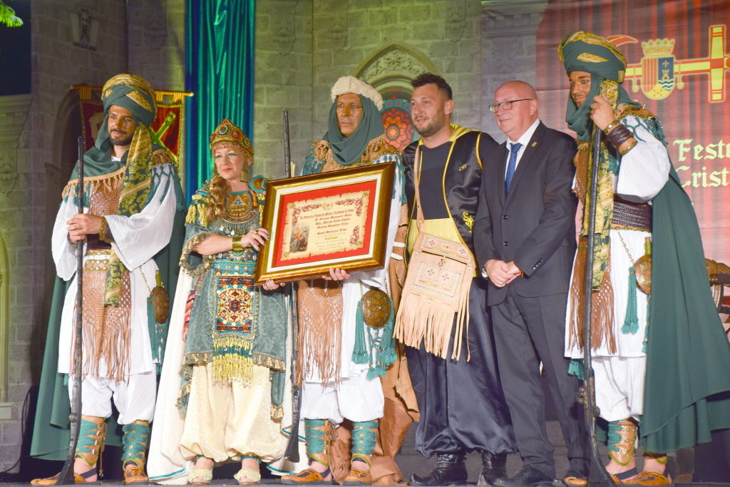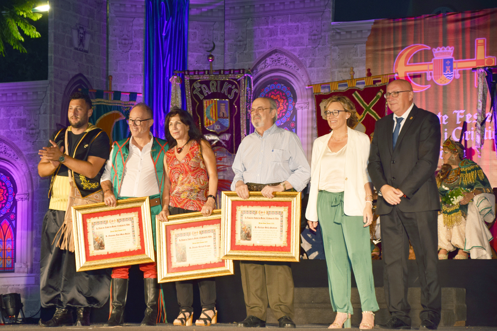 La velada fue muy emotiva, especialmente, para la familia Montaner Llidó. Tras una vida participando activamente en la consecución de la fiesta, ha llegado su momento de ser los grandes representantes de su otra familia, la Filà Almoriscos. Vicente Montaner Mata, conocido festero que tiene en su haber el Premi Sant Jaume en reconocimiento a su trayectoria festera, ostenta, junto a su esposa Merche Llidó Cholbi y sus hijos Moisés y Santi; el título de Capitanes 2023.