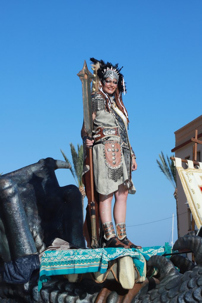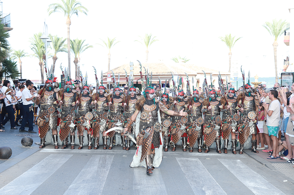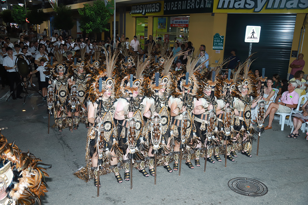 El resto del desfile se sucedió según el orden previsto. Las filaes avanzaron rápido para lograr mantener un buen ritmo que no provocara grandes separaciones entre las distintas bandas de música. Vanessa Garrido, Abanderada Cristiana, arrancó puntual a las 20h a lomos de un dragón bicéfalo y saludando al gran público que aplaudía su paso. Tras ella desfilaron Trabuquers, Contrabandistes, Bandoleres, Ballesters, Pirates de Sant Jaume y Faciners. Lucía Serrano, Abanderada Mora, dio paso a las tropas moras recibiendo el calor del gentío sobre un carruaje árabe. Las Filaes Xibia, Touaregs, Almoriscos, Almoradins, Al-Tarik’s y Schaitans.