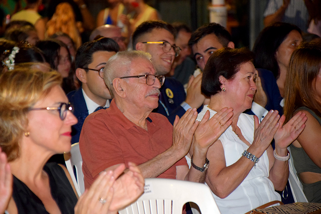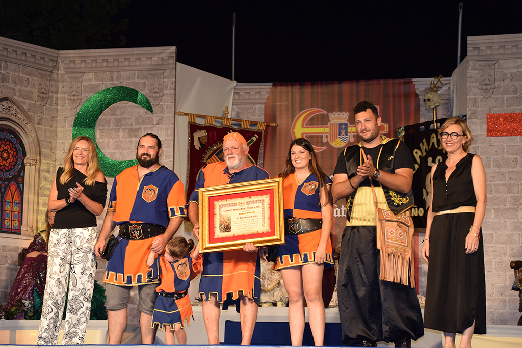 Otro de los grandes protagonistas que acaparó la atención fue el pregonero de esta edición. José Enrique Bas Espinós, alcalde de Xàbia entre 1974 y 1991, fue el encargado de exaltar la fiesta de forma muy emotiva a través de sus nietos. Los tres subieron al escenario en nombre de su abuelo, presente en el acto. Abordaron los peculiares inicios de la fiesta. Els Moros i Cristians de Xàbia surgieron en 1978 y tardaron unos pocos años en encontrarse a sí mismos en espacio y tiempo. Bas Espinós fue uno de los encargados de propiciar que la fiesta se asentara para consolidarse. En su pregón, realizó una metáfora en torno al hecho de identificarse como “moro” o “cristiano” y cómo no es tan importante el definirse, sino el ser y contribuir a engrandecer la fiesta.