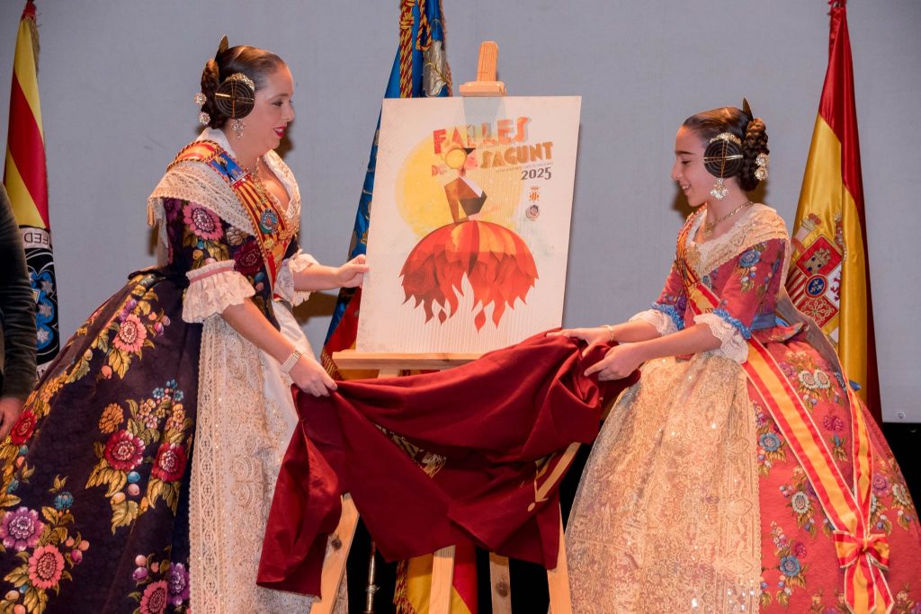El momento más esperado de la jornada llegó con la revelación del cartel anunciador de las Fallas 2025, obra del artista Sergio Iborra Colomer, quien revalida su triunfo al ganar este concurso, por segundo año consecutivo, organizado por el Ayuntamiento de Sagunt. El anuncio del ganador corrió a cargo de las Falleras Mayores de FJFS, Julia Palanca y Teresa Aparicio, acompañadas por sus respectivas Cortes de Honor, la concejala de Fiestas de Sagunto, Patricia Sánchez, y la concejala de Cultura, Ana María Quesada.
