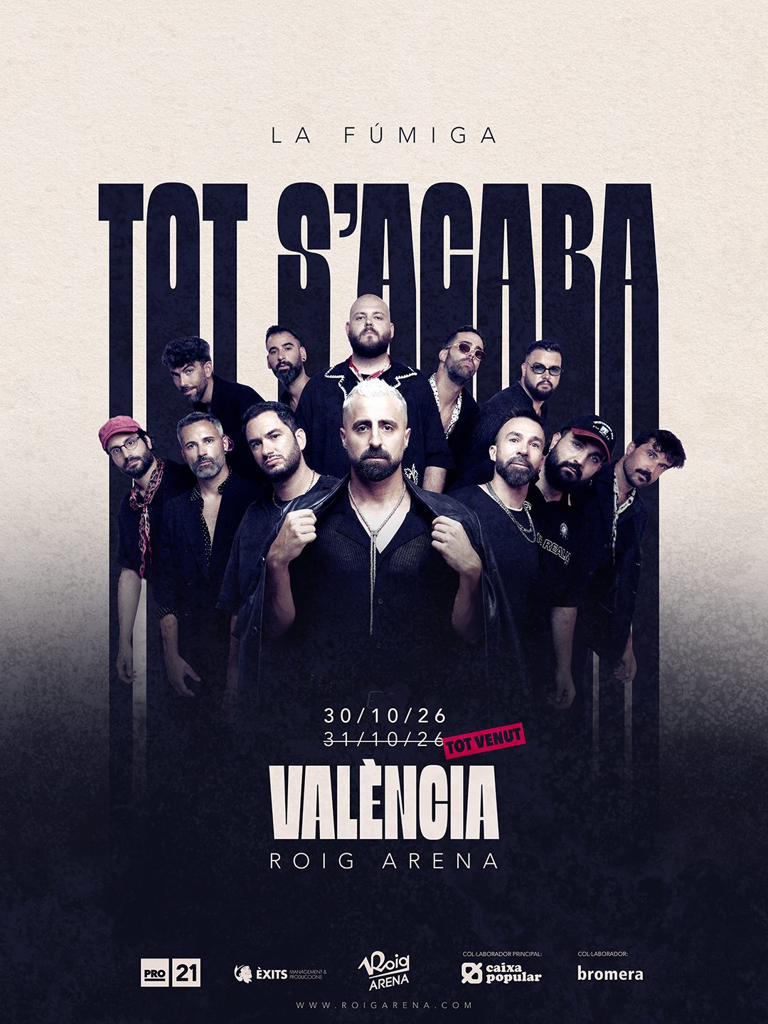 La banda valenciana La Fúmiga ha sumat un nou concert al Roig Arena, el nou recinte multiusos de València impulsat per Juan Roig: el divendres 30 d’octubre del 2026. A més, el concert anunciat per al dissabte 24 d’octubre passarà finalment al dissabte 31 d’octubre.