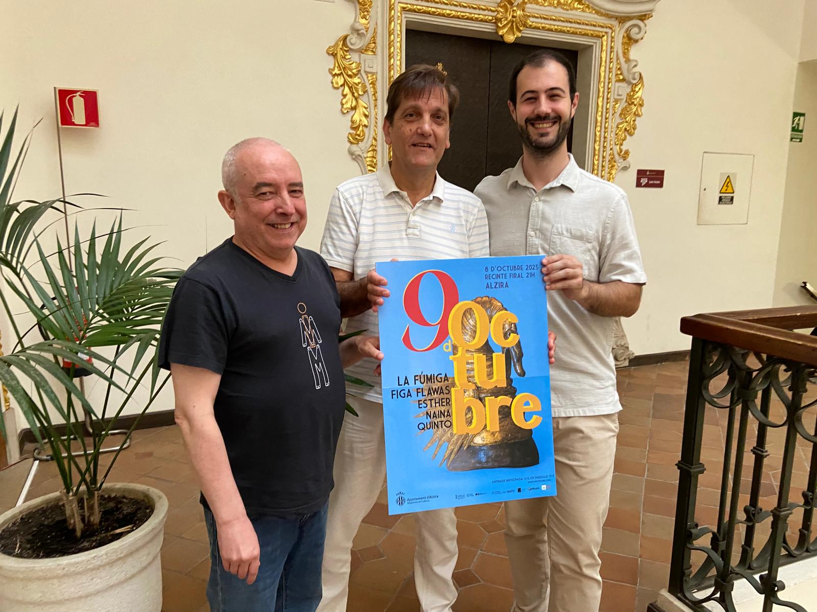 L’Ajuntament d’Alzira presenta el cartell de la dècima edició del concert per a celebrar la festivitat del Nou d’Octubre. Alzira tornarà a celebrar la festa de tots els valencians amb este tradicional concert que organitza la Regidoria de Cultura i que se celebra la vespra d’esta festivitat, el dia 8, a partir de les 21 hores, al Recinte Firal.