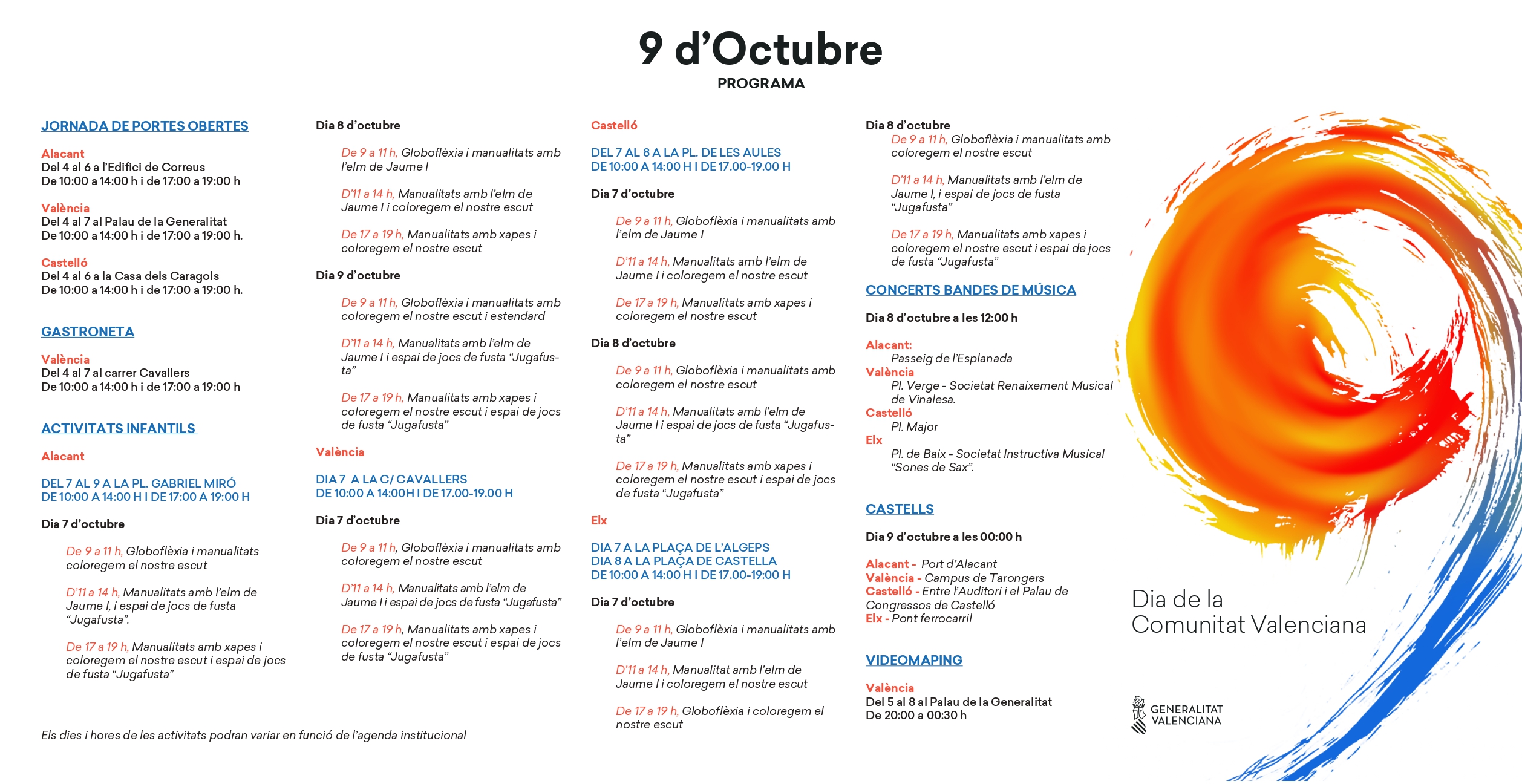 La Generalitat ha programado conciertos de bandas de música, actividades lúdicas infantiles, castillos de fuegos artificiales y jornadas de puertas abiertas para celebrar el 9 d’Octubre, Día de la Comunitat Valenciana. La programación arrancará el miércoles, 4 de octubre, con propuestas que se desarrollarán en las ciudades de València, Alicante, Castelló de la Plana y Elche.
