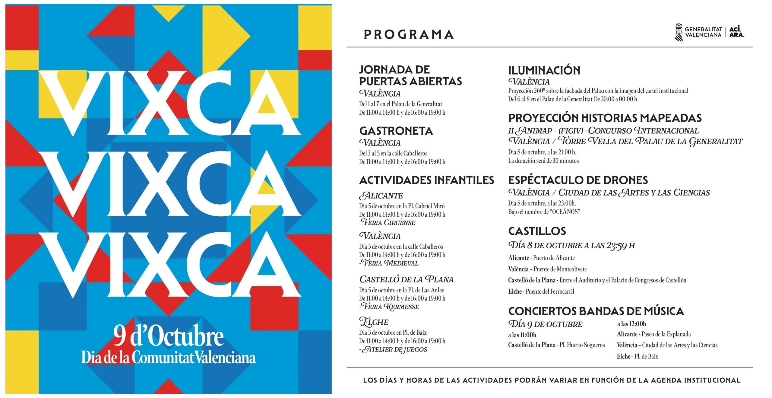 La festividad se inicia hoy con las jornadas de puertas abierta del Palau de la Generalitat hasta el 7 de octubre, que se completará con actividades infantiles el 5 de octubre en Alicante, València, Castelló de la Plana y Elche, y la proyección de historias mapeadas el 8 de octubre sobre la Torre Vella del Palau.
