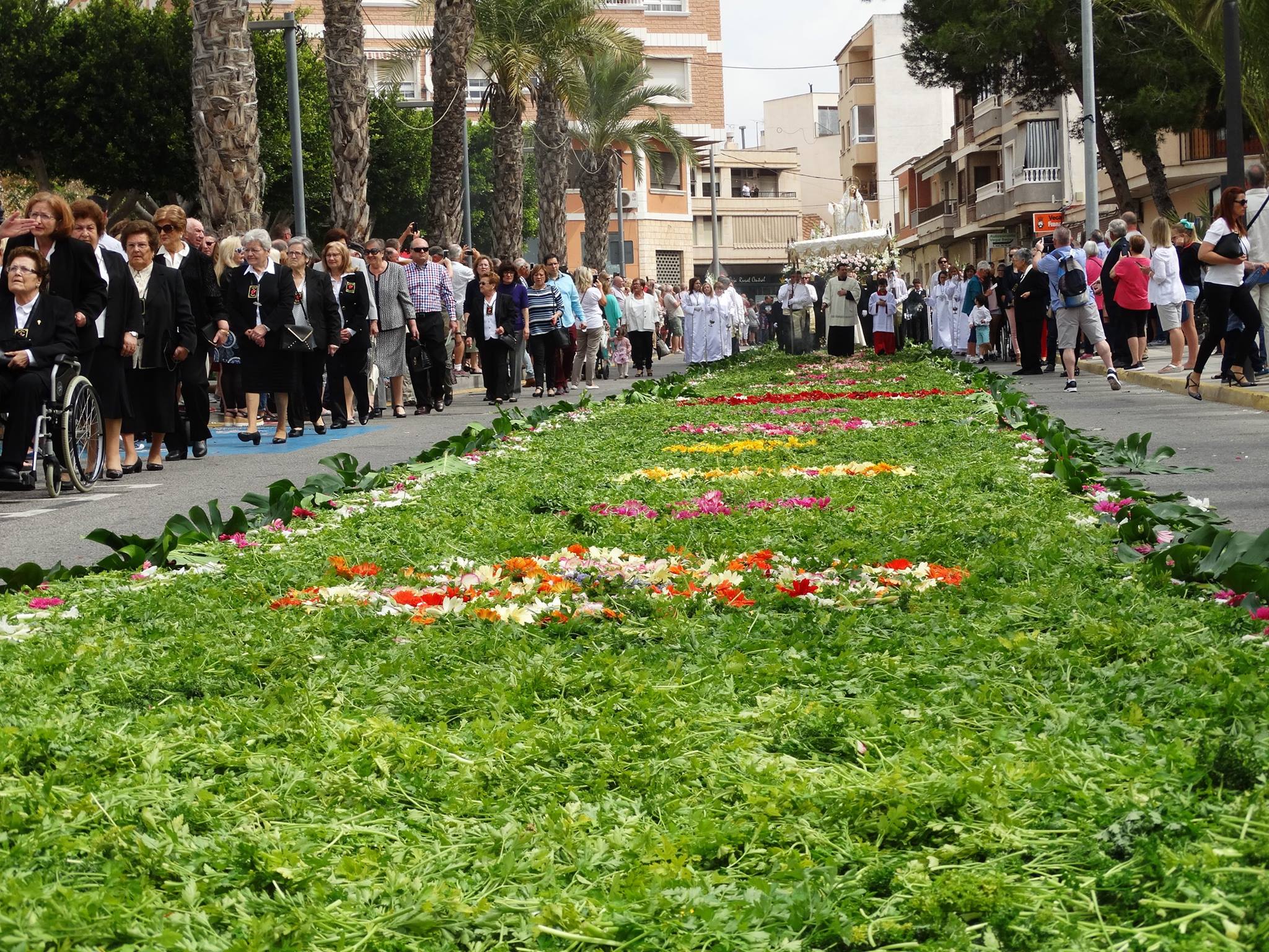 Uno de los aspectos más destacados y originales de esta festividad es el manto floral que cubre el recorrido del Santísimo, elaborado de manera artesanal por los vecinos del municipio. Cientos de personas participan durante días en la confección de este manto con flores naturales, reflejando la implicación y el espíritu colaborativo de la comunidad.