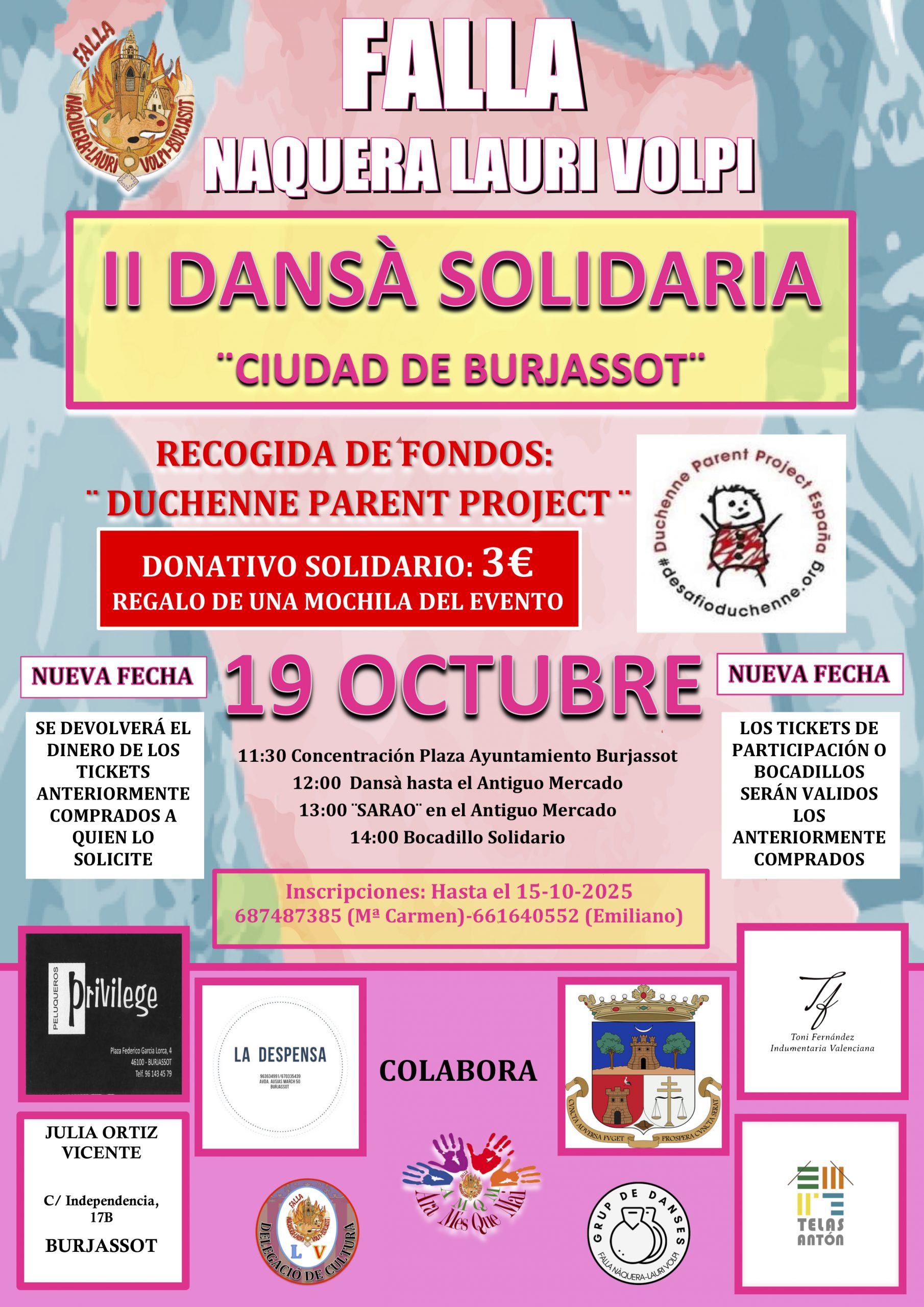 Tras tener que aplazar la actividad el pasado mes de septiembre, desde la Falla Náquera- Lauri Volpi de Burjassot han confirmado que ya tienen nueva fecha para celebrar su II Dansà Solidaria Ciudad de Burjassot que tendrá lugar el domingo 19 de octubre a partir de las 11.30 horas. Acto que cuenta con la colaboración del Ayuntamiento de Burjassot, desde la Concejalía de Fallas, dirigida por Estefanía Ballesteros.