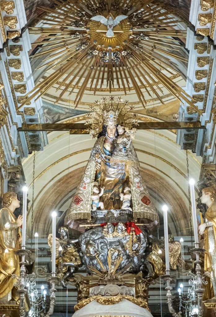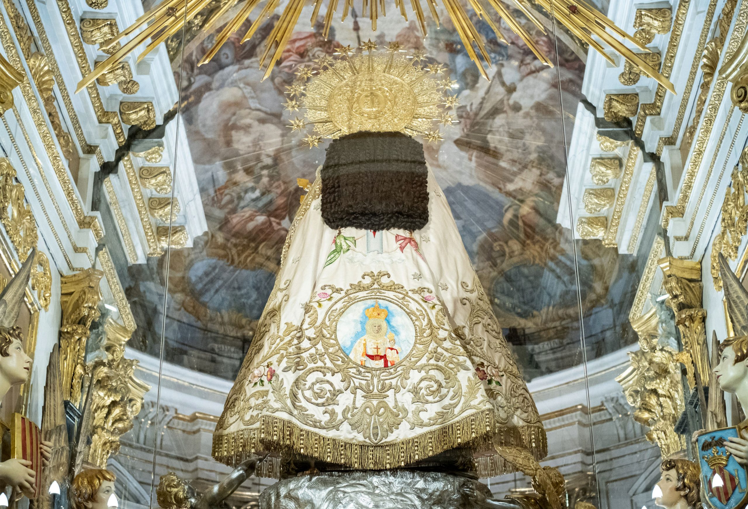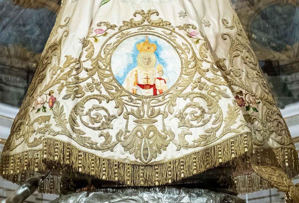 La imagen de la Virgen de los Desamparados del altar mayor de la Basílica luce desde hoy, y durante los próximos meses, un manto de seda y oro, del año 1957, que ha sido recientemente restaurado.