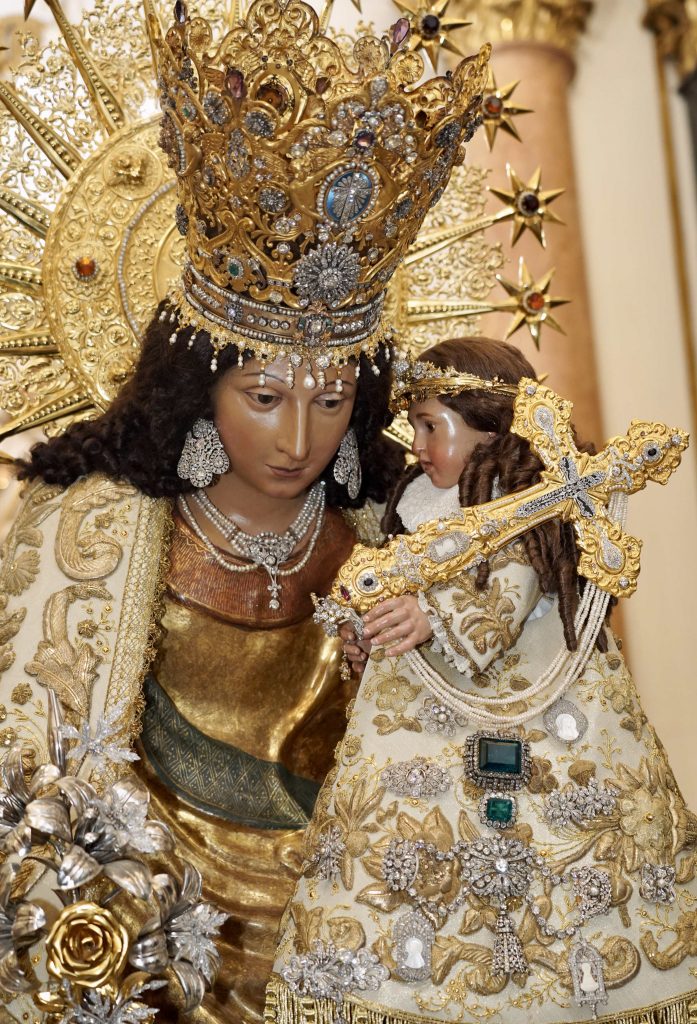 La imagen original de la Mare de Déu lleva el Manto de la Coronación, uno de sus mantos históricos confeccionado en 1867 en tisú de oro y plata brescada y bordado en realce. Fue el que portó en el acto de su Coronación Pontificia en 1923.