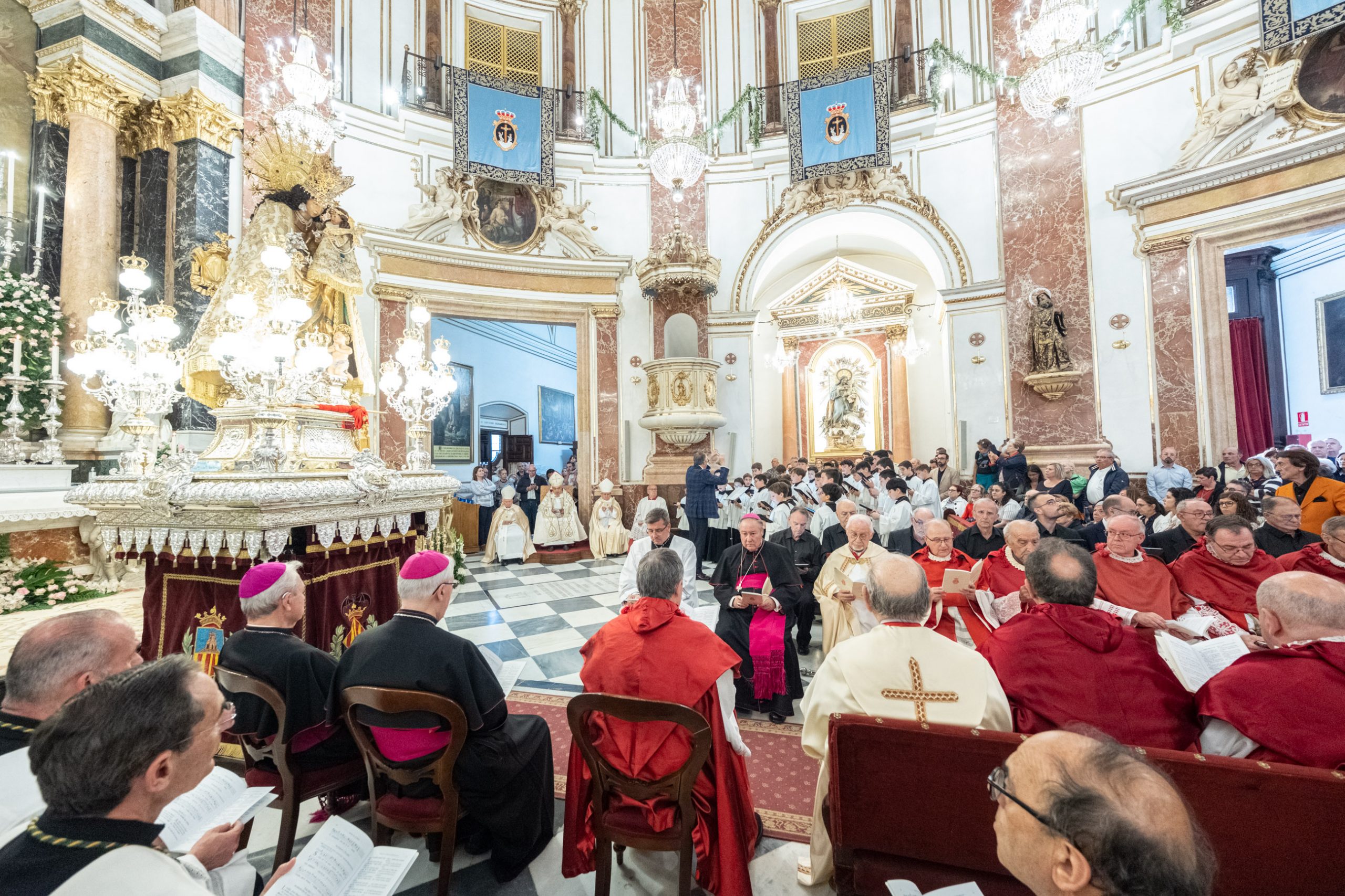 En la celebración ha tomado parte el Arzobispo, Obispos, Cabildo de la Catedral y el Clero de la Basílica, y en el acto ha intervenido con sus cantos la Escolanía de la Virgen de los Desamparados.