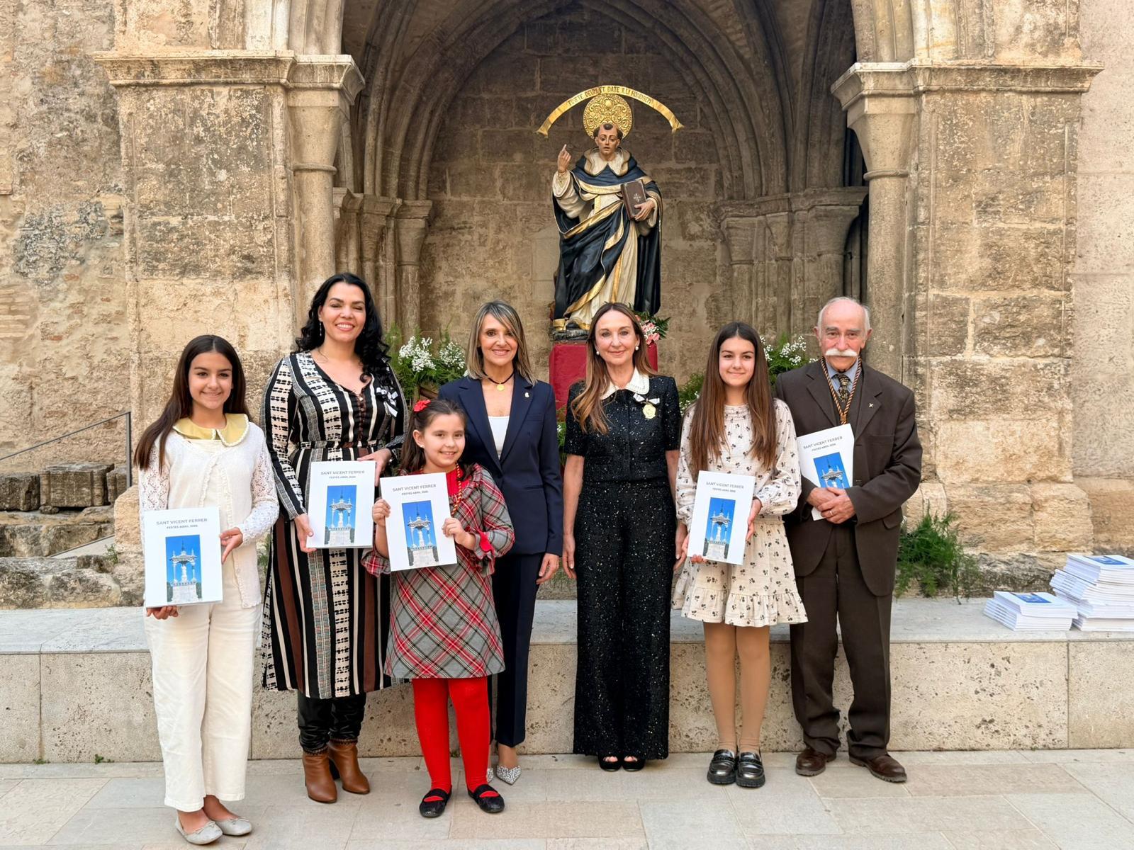 El pati exterior de l’església de Sant Joan de l’Hospital ha acollit este divendres la presentació del Llibre Oficial de les Festes en honor a Sant Vicent Ferrer 2026, un acte que ha reunit representants del món vicentí com la Clavariessa, Vicenta Evangelina Escudero, autoritats, presidents d’altars, clavaris majors i participants de la festa.