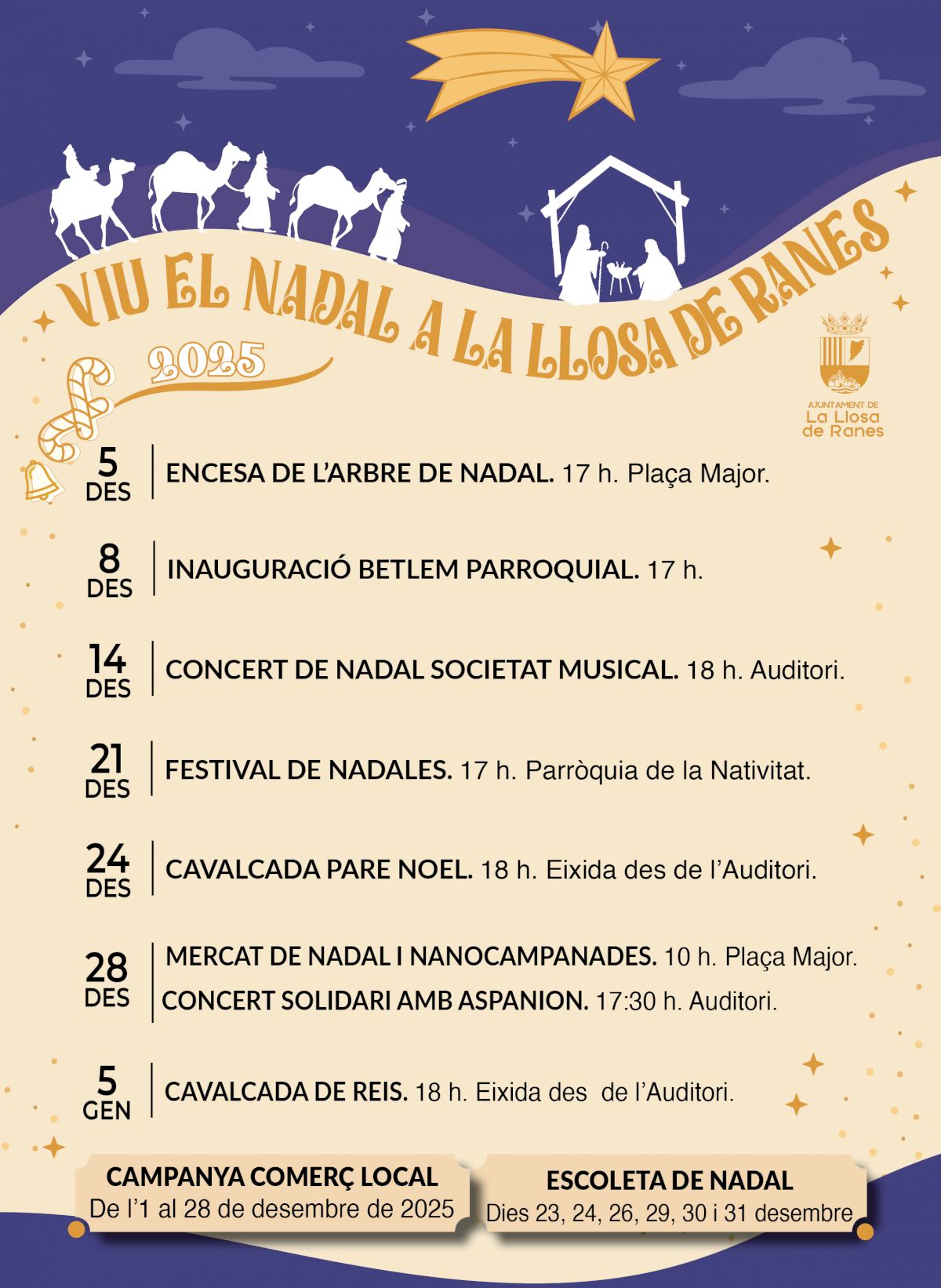 L’Ajuntament de la Llosa de Ranes ha organitzat una variada programació d’activitats per a celebrar Nadal. Els actes s’inicien el pròxim divendres 5 de desembre amb l’Encesa de l’Arbre de Nadal.