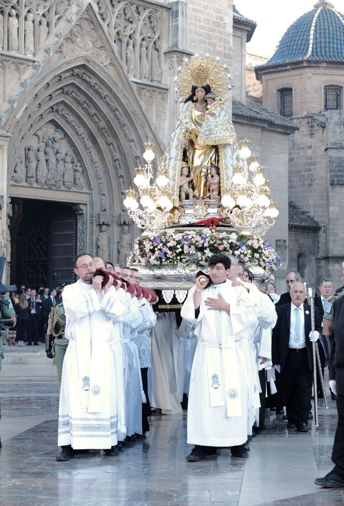 La procesión ha comenzado con la salida, desde la Catedral, de la imagen de la Mare de Déu que, portada a hombros, ha lucido el conocido como “Manto del Año Mariano Universal” del año 1954, cuya restauración ha sido presentada esta semana en el Camarín de la Mare de Déu.