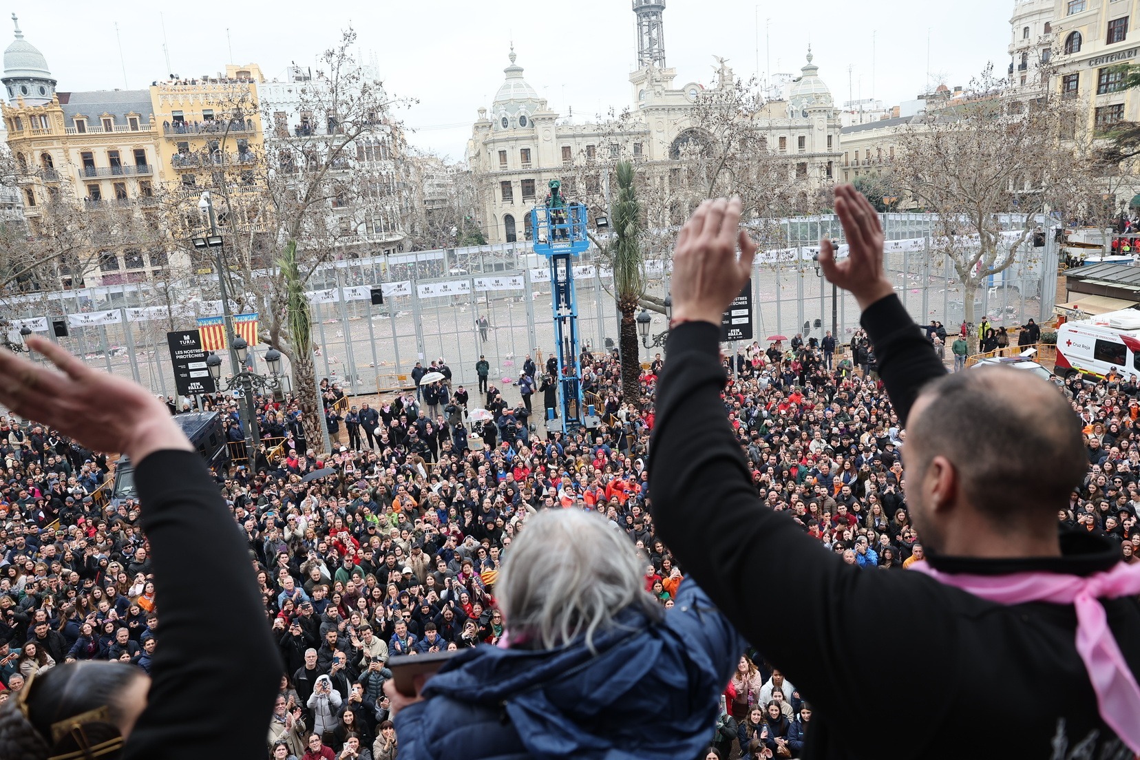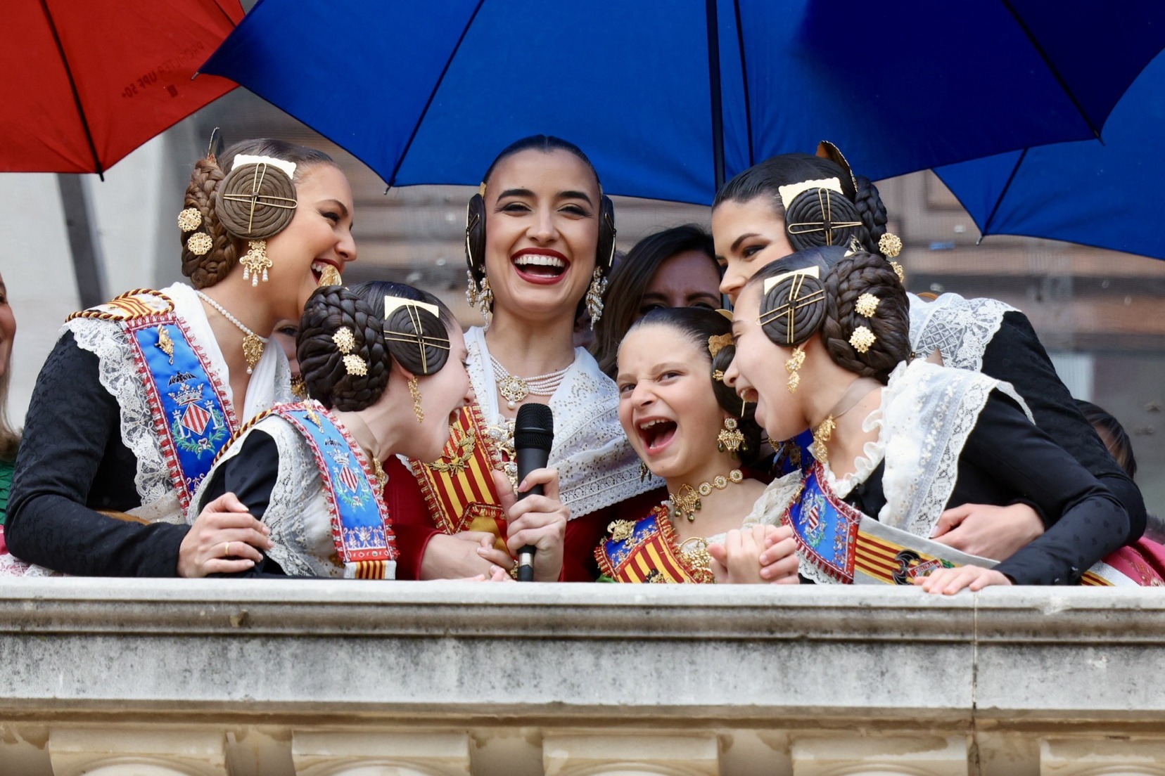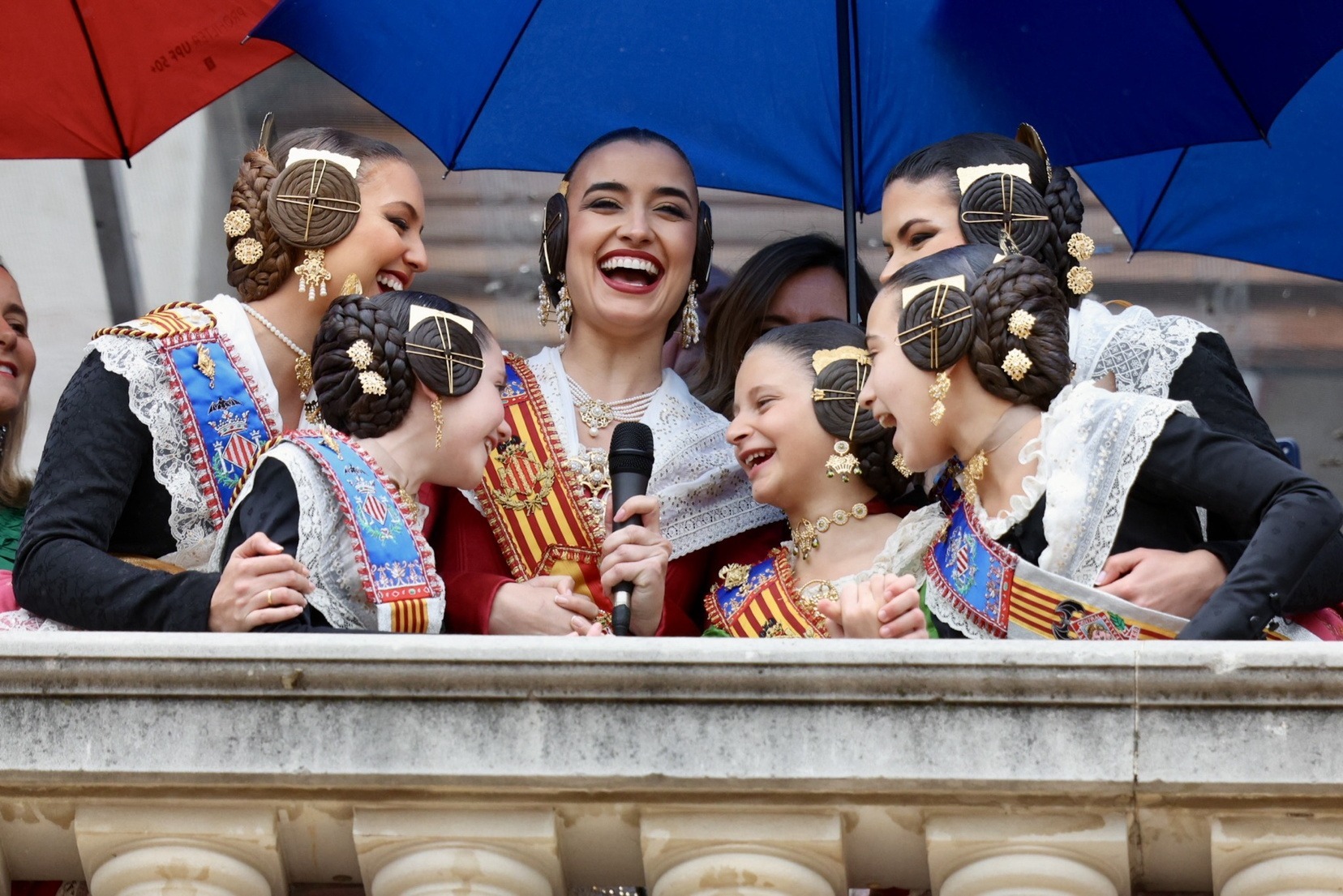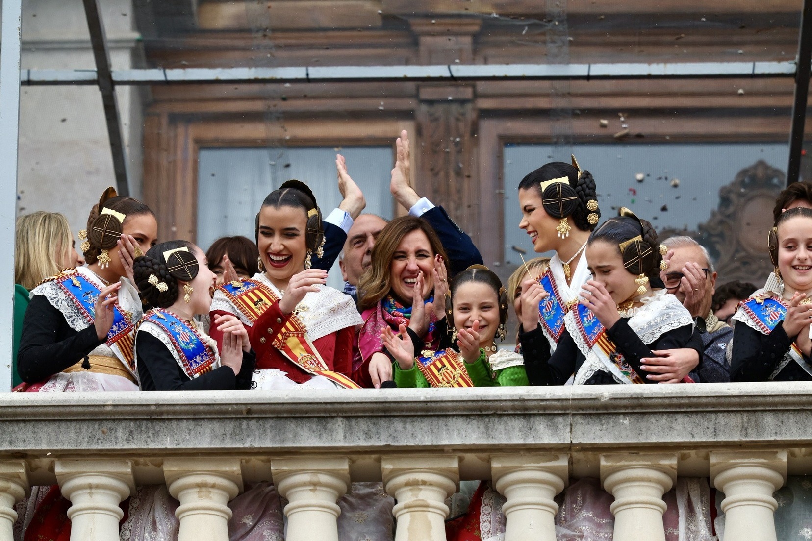 En el Balcón del Ayuntamiento, las Falleras Mayores de Valencia, Carmen Prades y Marta Mercader, han vivido con mucha emoción esta mascletá. Junto a ellas, sus Cortes de Honor, así como la alcaldesa de nuestra ciudad, María José Catalá, y Santi Ballester, concejal de Fallas y presidente de Junta Central Fallera.