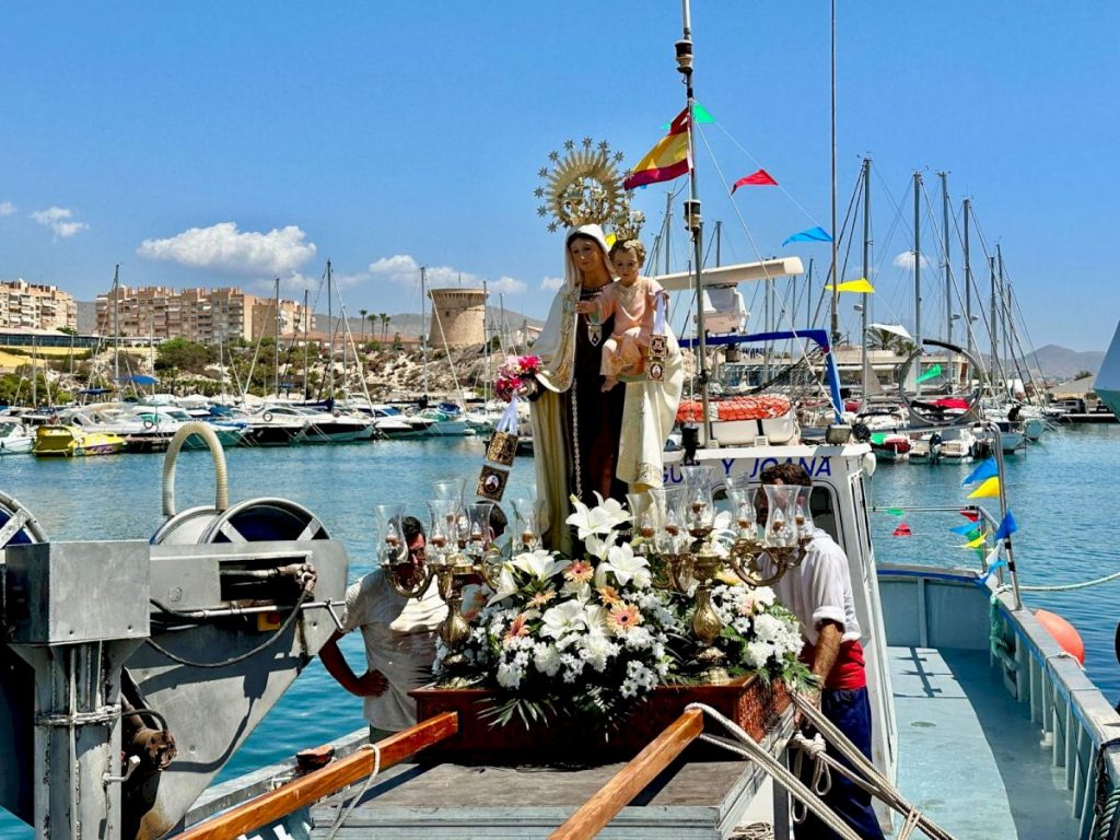 Después de celebrada la Misa, se ha procedido a la bendición de los escapularios confeccionados para conmemorar el centenario de las fiestas, y finalmente, también al son de la música de la banda La Nova, la imagen de la Virgen del Carmen se ha trasladado a la embarcación sobre la que esta tarde viajará en su recorrido por la costa durante la procesión marinera, uno de los principales actos de los festejos. Este año se trata del barco “José Miguel y Joana”, capitaneado por Fernando Pérez.