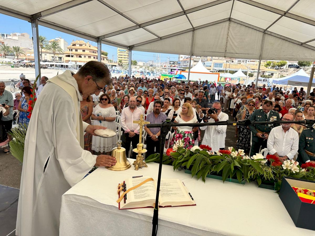 Tras bendecir ambos distintivos por parte del párroco Pedro Juárez, el alcalde Juanjo Berenguer ha hecho entrega del regalo a la máxima autoridad de la Armada que ha visitado hoy El Campello, que era Jorge Ángel Jiménez Ayala, teniente de navío y comandante del patrullero Formentor.