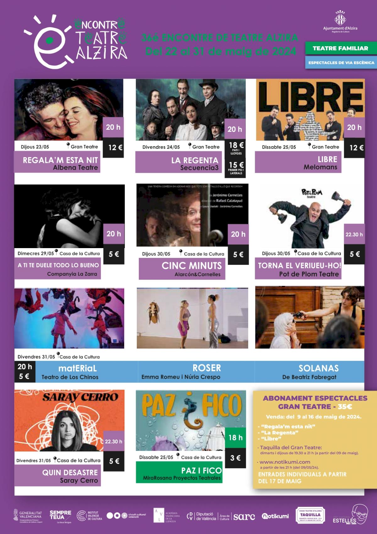 L’obertura de l’Encontre dijous 23 de maig la protagonitzarà l’actor i dramaturg alzireny Carles Alberola amb l’estrena de Regala’m esta nit, dirigida i protagonitzada pel mateix Alberola junt amb Verònica Andrés. Divendres 24 de maig el Gran Teatre d’Alzira acollirà la producció de Secuencia3 La Regenta, una adaptació de la novel·la de Leopoldo Alas “Clarín” protagonitzada entre altres per l’actor alzireny Àlex Gadea, que tornarà als escenaris de la ciutat. I ja, en acabant, Melomans presentarà l’espectacle de teatre musical Libre, tot un homenatge al cantant d’Aielo del Malferit, Nino Bravo, un recorregut per 61 cançons en 90 minuts.