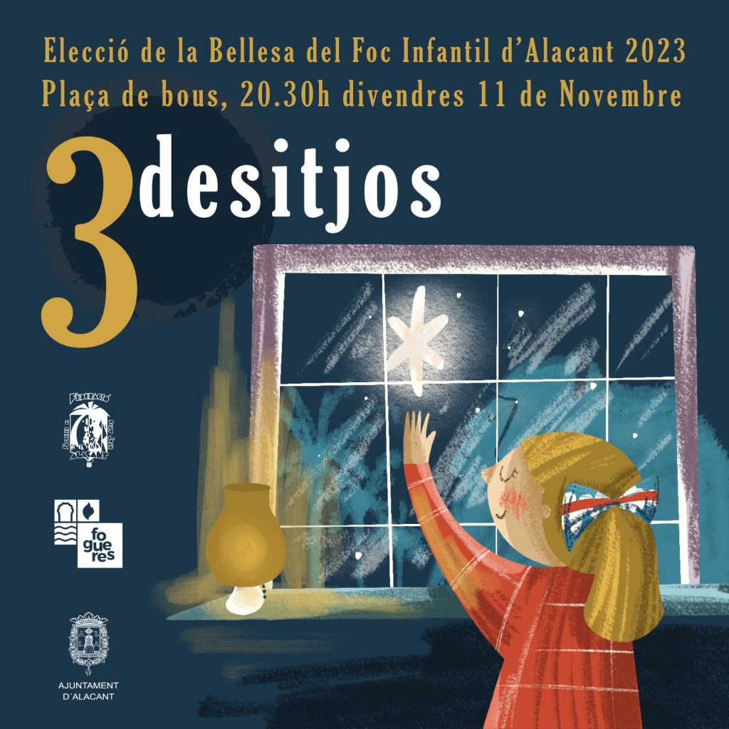 “3 Desitjos”, es el lema elegido para la elección de la bellesa del foc infantil 2023. Es un cuento que trata sobre una niña que al acostarse le da las buenas noches a una estrella. Esta agradecida, decide concederle tres deseos. Estos tres deseos son las tres partes de la elección.