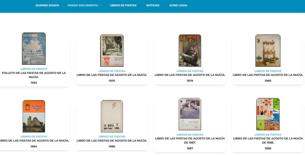 Se han digitalizado todos los libros y folletos de fiestas de La Nucía desde 1953 hasta la actualidad. En concreto todos los folletos de fiestas (“Programa de Festes”) desde 1966 hasta 1975 de forma correlativa, más el de 1953. El “Llibre de Festes de La Nucia” comenzó a editarse en 1976 y se han digitalizado todos los ejemplares hasta la actualidad, con un total de 43 “llibres” (1976-2024). A esta serie documental se sumará el “Llibre de Festes 2025”, próximamente.